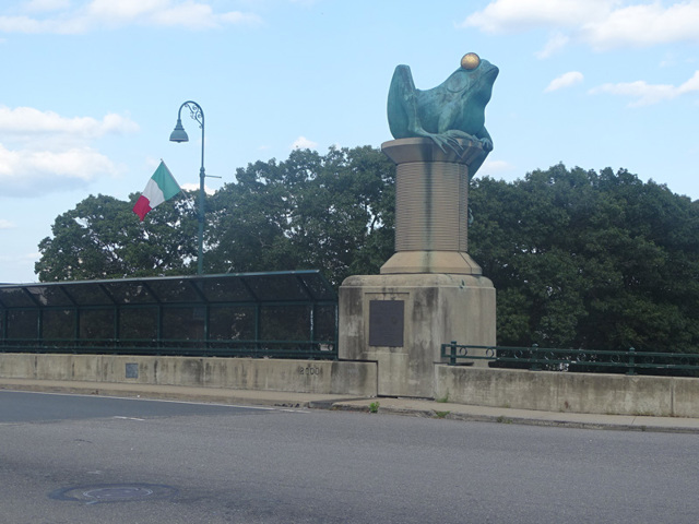 The Thread City Crossing is a bridge over the Willimantic River connecting Pleasant Street (CT 32) on the south side with Main Street (CT 32) on the north side in the downtown area of Willimantic. It is also known as the Frog Bridge because it is surrounded by sculptures of frogs. (And no, it's not just the frog's neck. It's the whole frog!) Why are these sculptures there? They commemorate the "Battle of the Frogs" during the French and Indian War. People living in Windham heard a strange noise in the night and thought that they were being attacked by the French. They grabbed their muskets and fired into the darkness to defend themselves from the perceived attack. When the sun rose in the morning, they discovered that they had been shooting at frogs rather than French invaders.