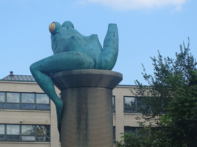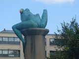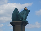 These pictures show the sculptures of frogs that surround the Thread City Crossing.