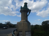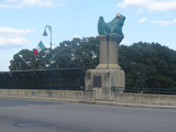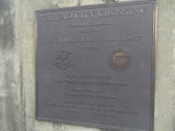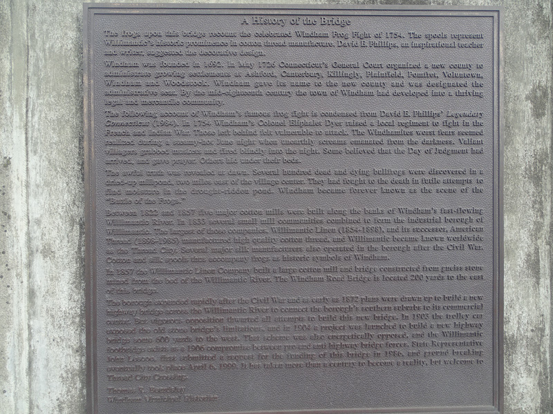 These historical plaques are found on the Thread City Crossing. One of them discusses the "Battle of the Frogs" commemorated by the sculptures.