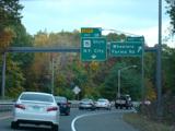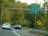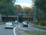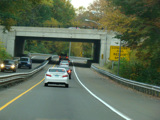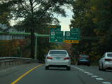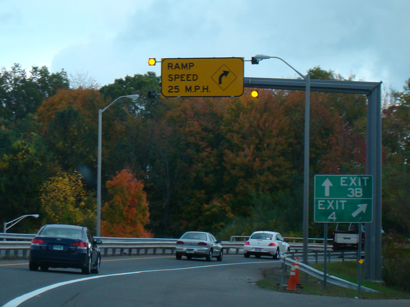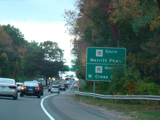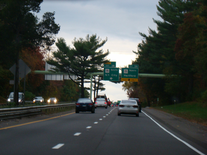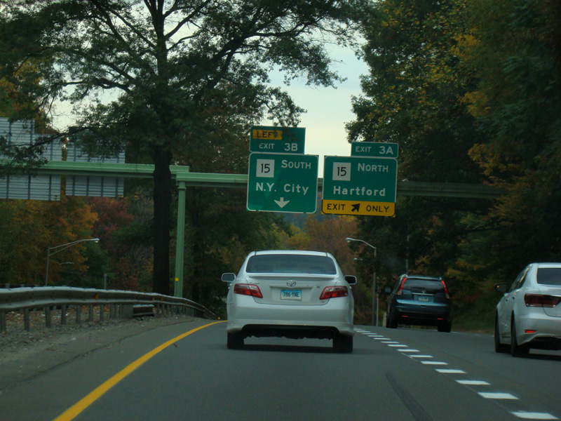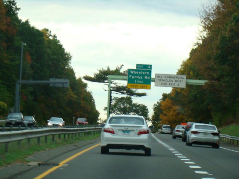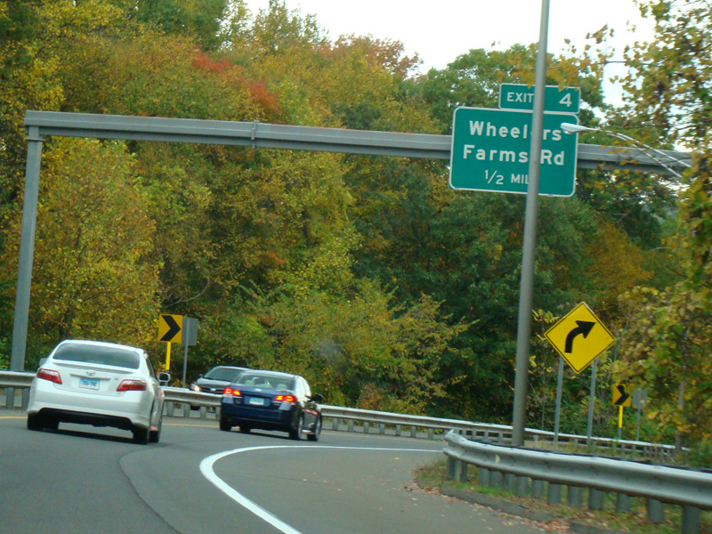 The Milford Parkway runs north from Boston Post Road (US 1) to CT 15. Exit 3A is for the Wilbur Cross Parkway (CT 15) north. Exit 3B is for the Merritt Parkway (CT 15) south. Exit 4 is for Wheelers Farm Road.