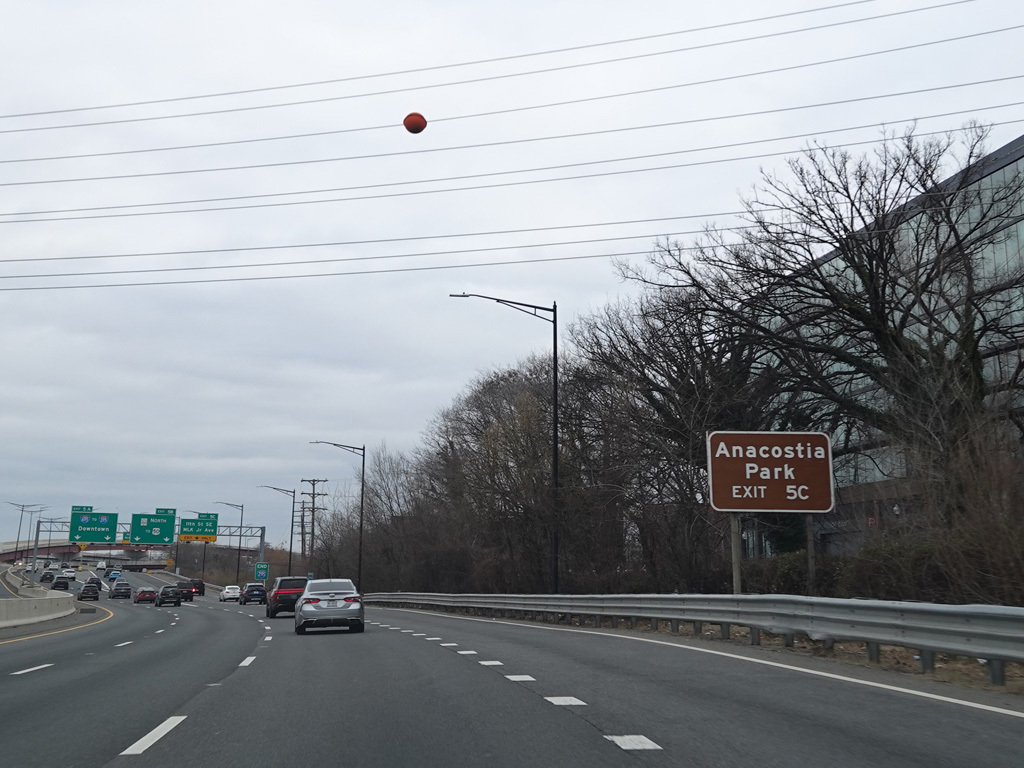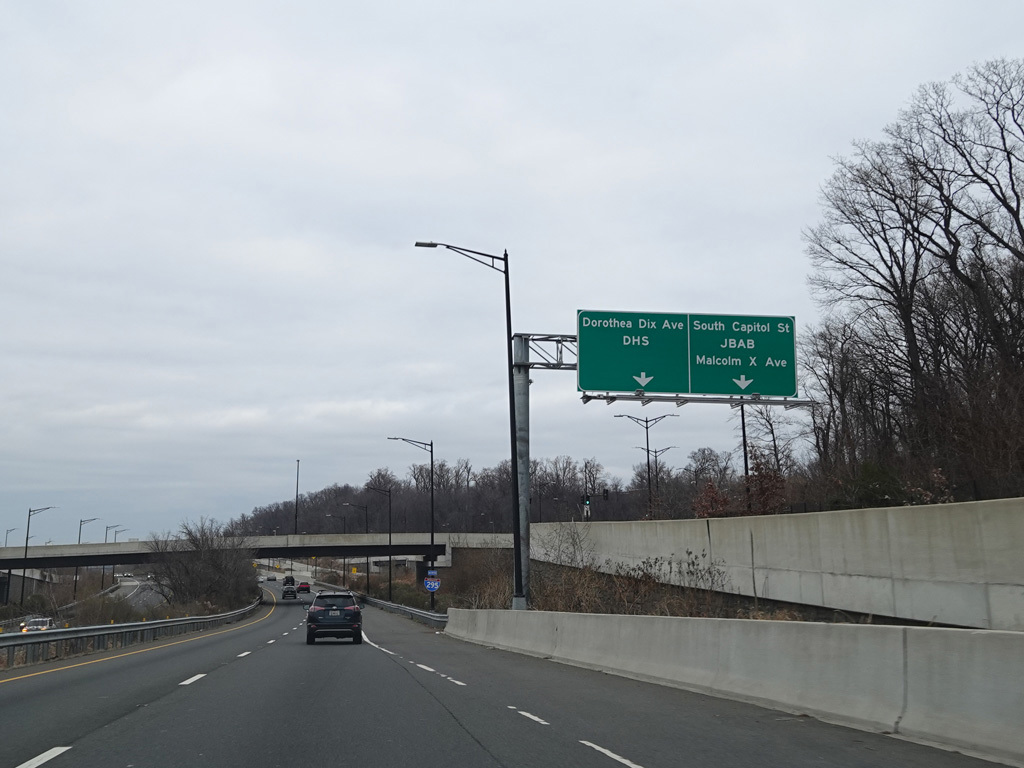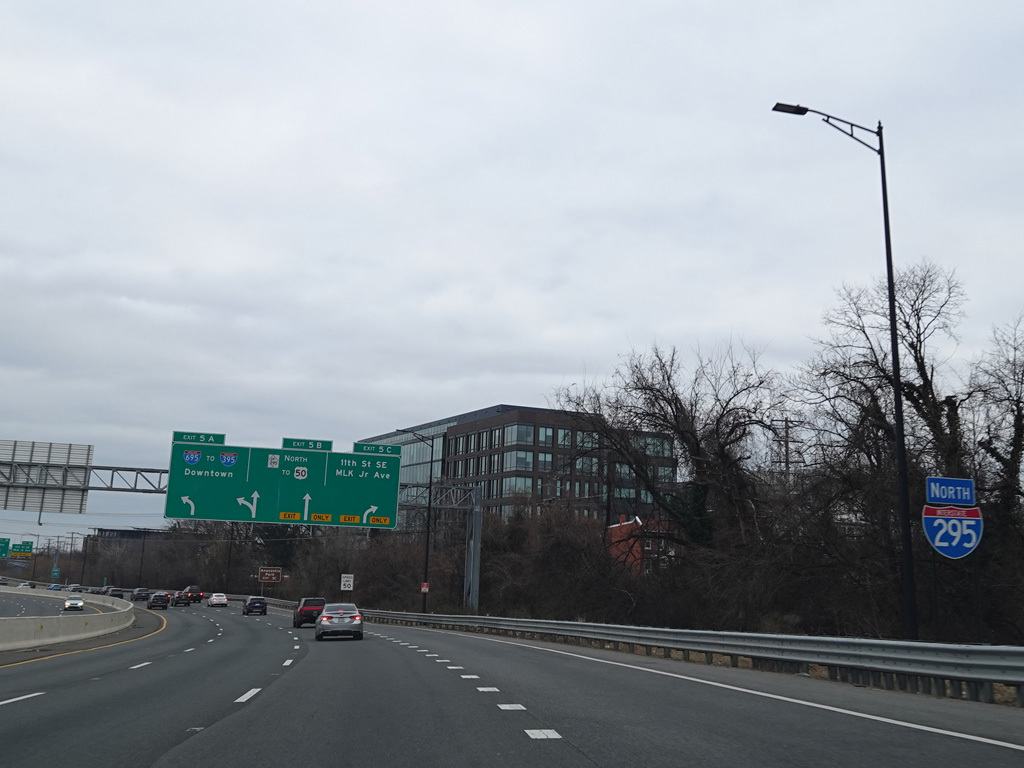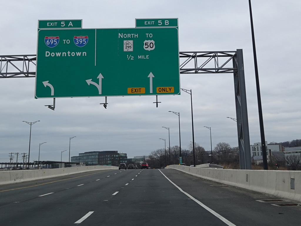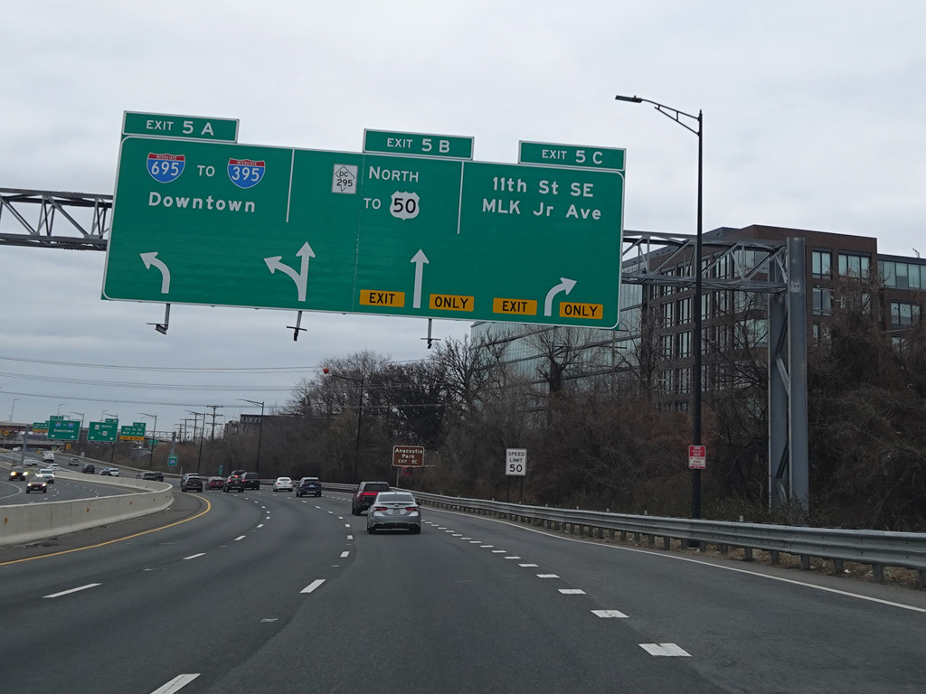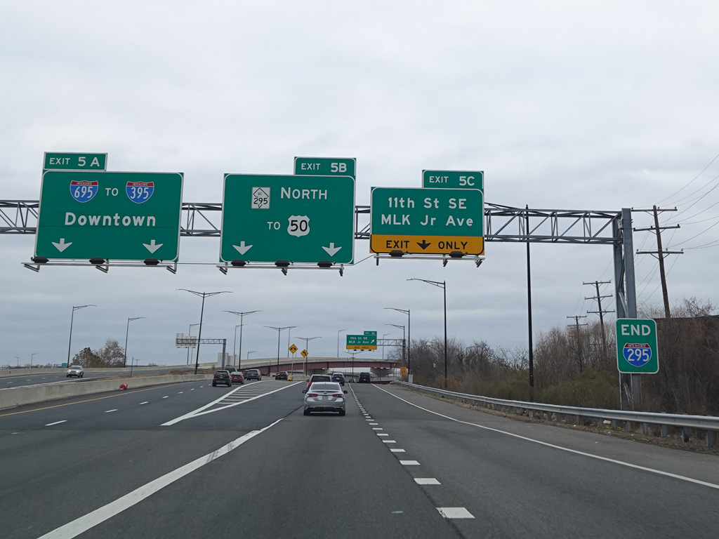 Exit 5A is for the Southeast Freeway (I-695). I-295 ends here. The Anacostia Freeway continues straight ahead as DC 295, which is marked as exit 5B. Exit 5C is for 11th Street SE and Martin Luther King Jr. Avenue.