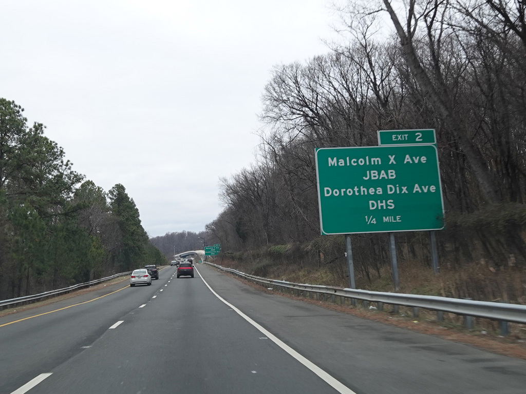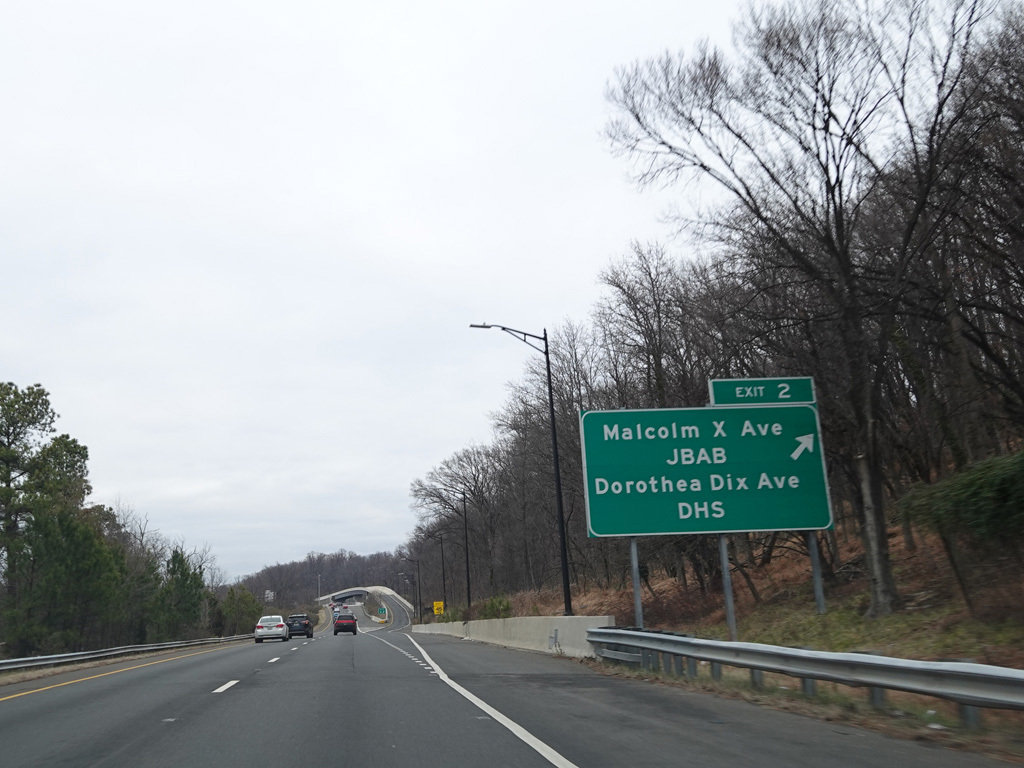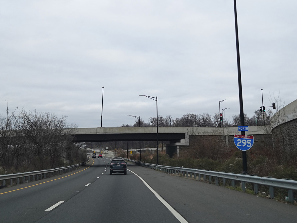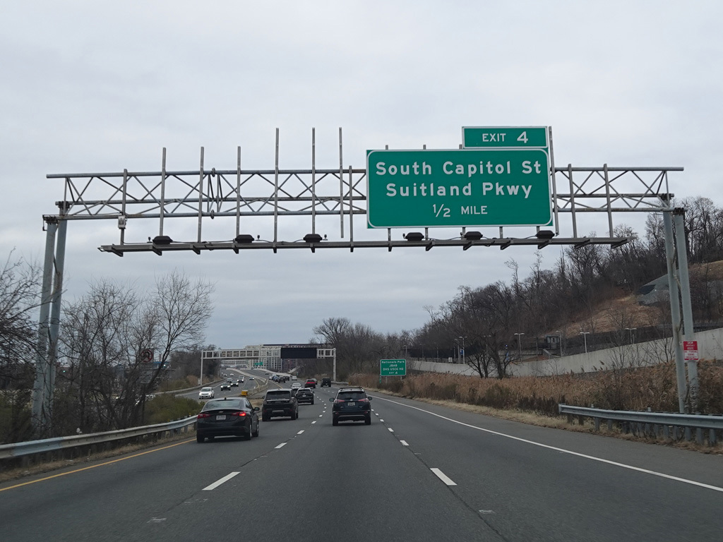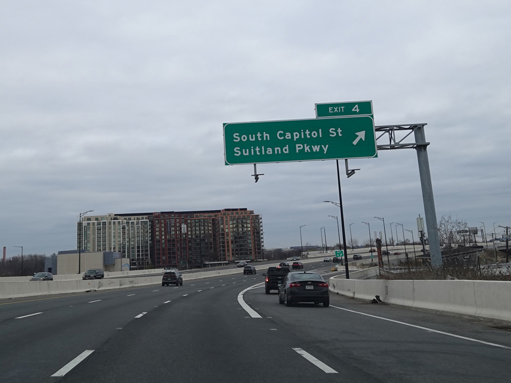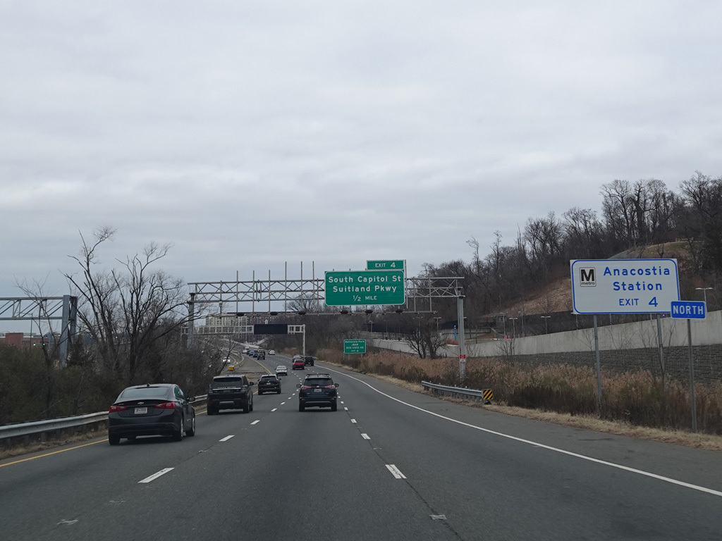 Exit 5A is for the Southeast Freeway (I-695). I-295 ends here. The Anacostia Freeway continues straight ahead as DC 295, which is marked as exit 5B. Exit 5C is for 11th Street SE and Martin Luther King Jr. Avenue.