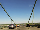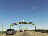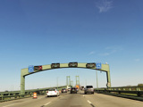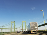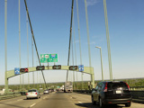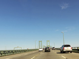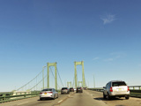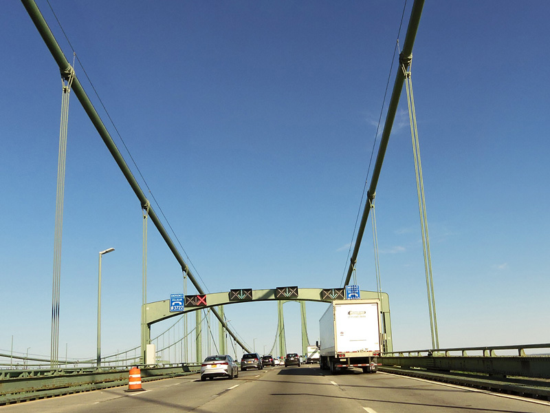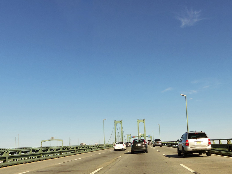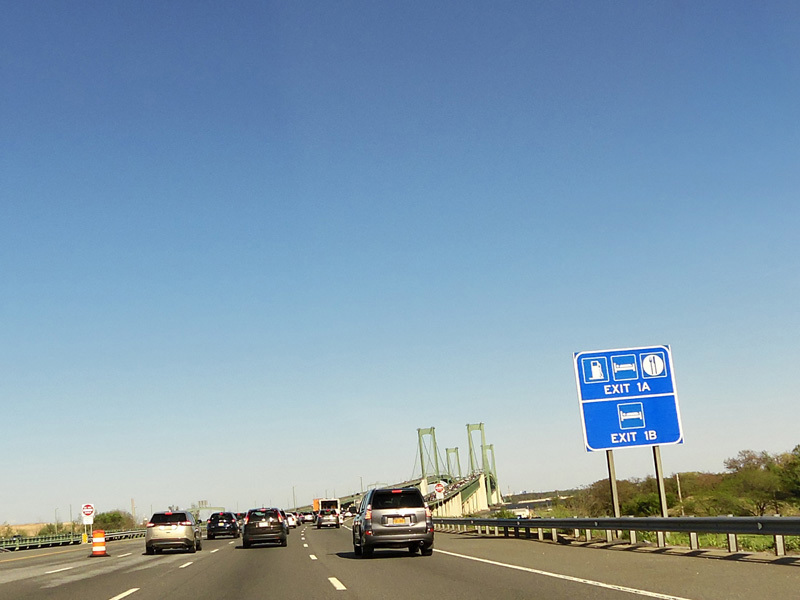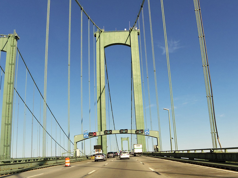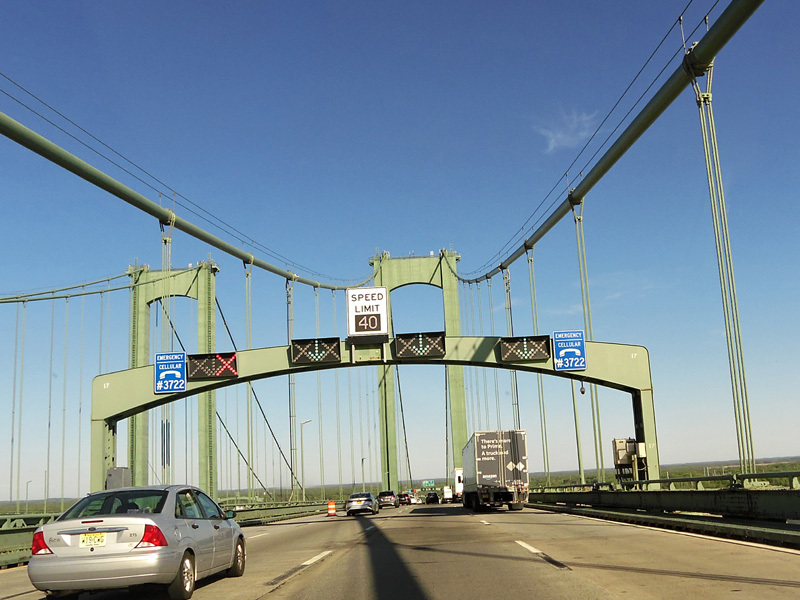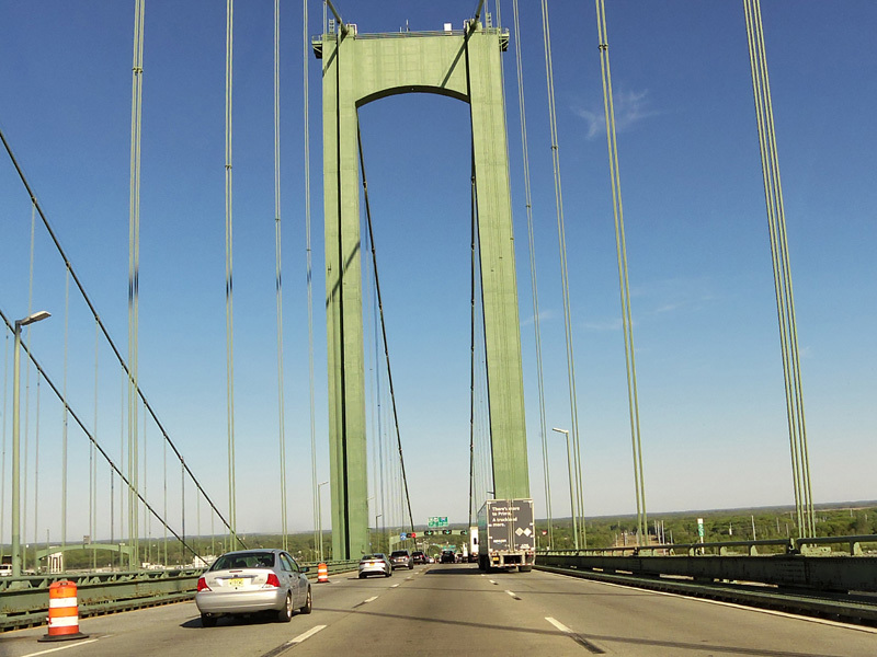 The Delaware Memorial Bridge is a suspension bridge over the Delaware River from Delaware to New Jersey. On the other side, the road splits. Use the right lanes for I-295. Use the left lanes for the New Jersey Turnpike (NJ 700) and US 40.