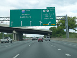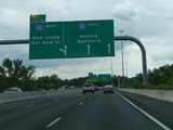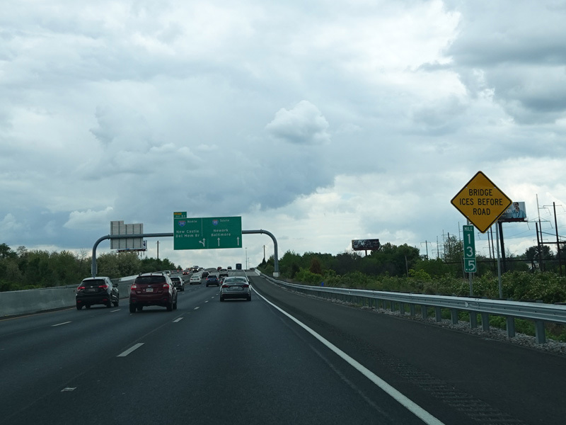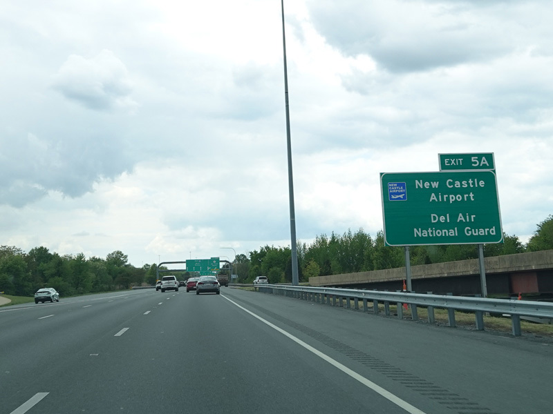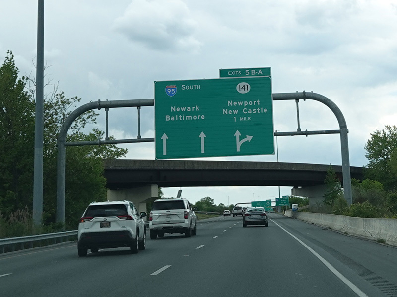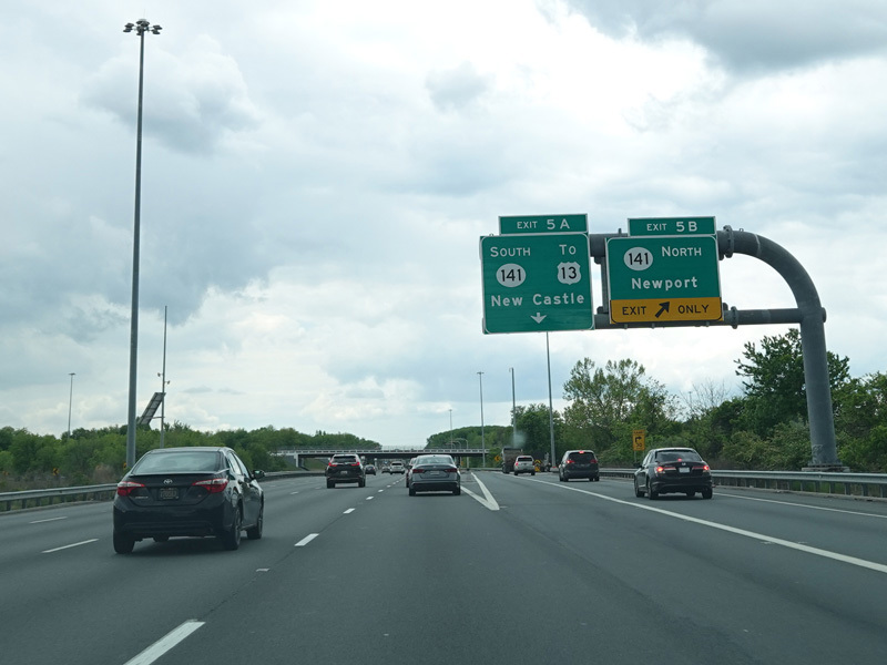 Exits 5A-B are for Basin Road (DE 141). US 202 leaves I-95 here and follows Basin Road south to US 13/US 40, but it is unsigned here.