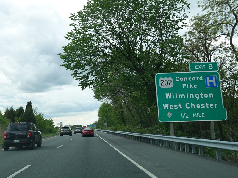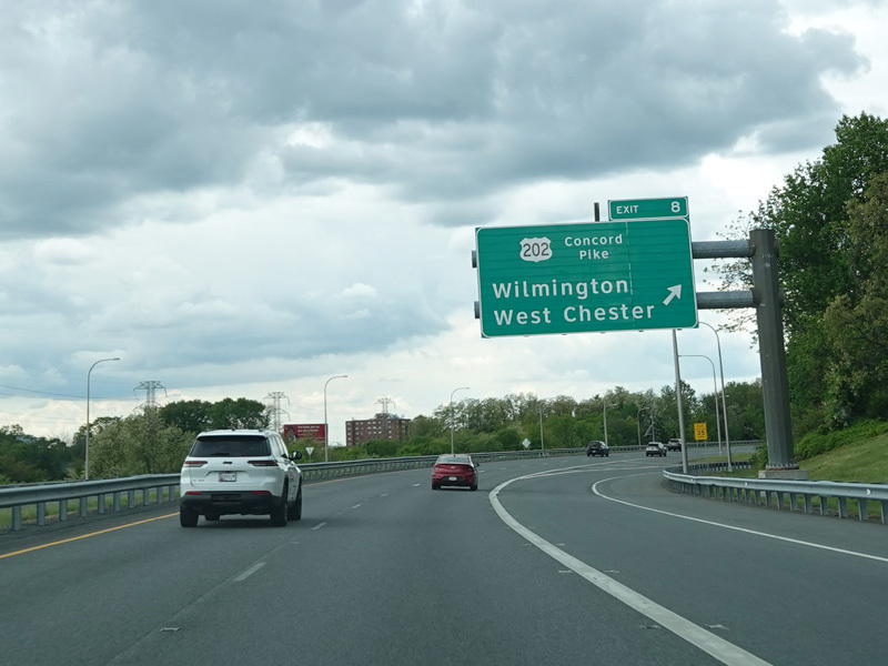 Exit 8 is for Concord Pike (US 202). Southbound US 202 is multiplexed with I-95 straight ahead, although there is no signage to indicate so.