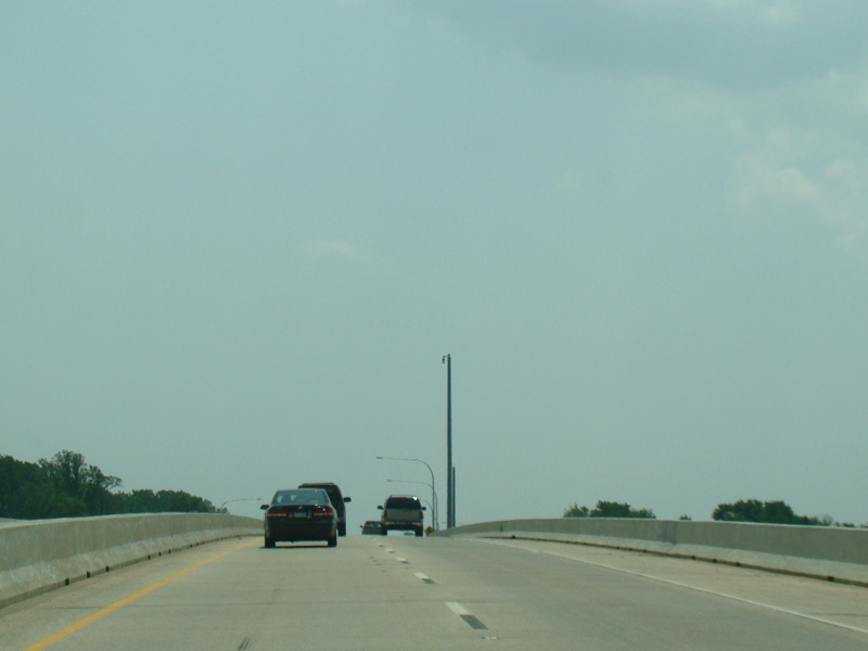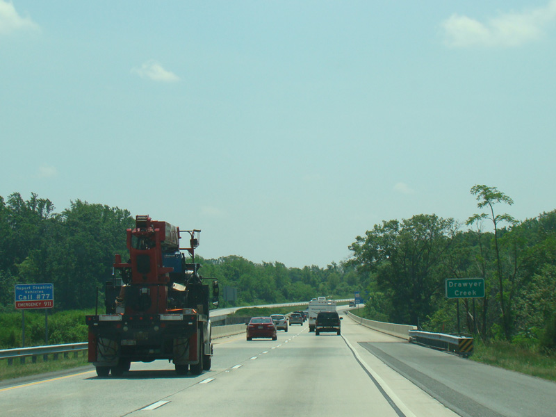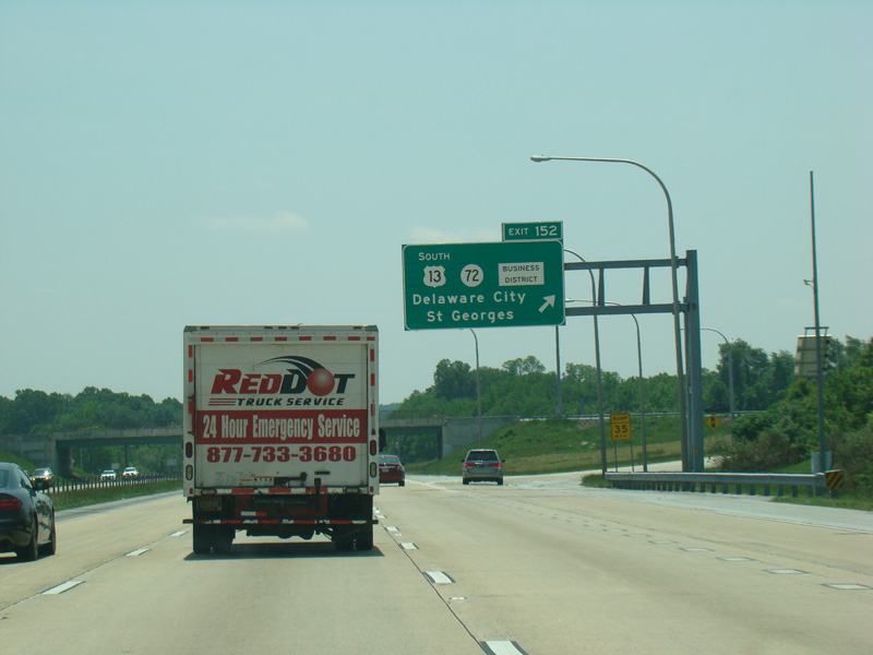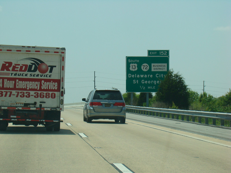 There is a bridge across Red Lion Creek. Exit 152 is for Dupont Parkway (US 13) south and Wrangle Hill Road (DE 72).