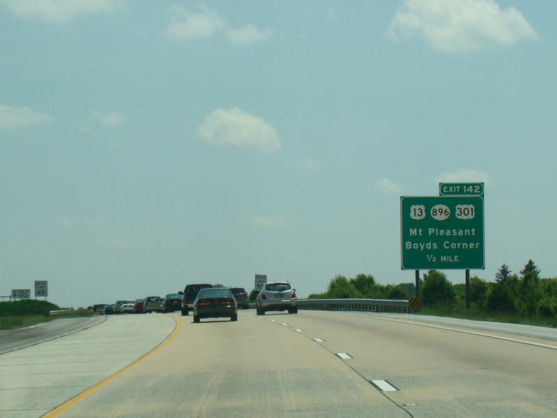 Exit 142 is for Dupont Parkway (US 13), Boyds Corner Road (DE 896), and Summit Bridge Road (US 301).