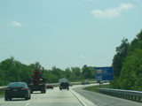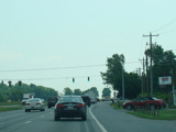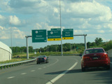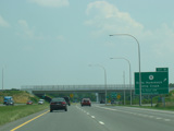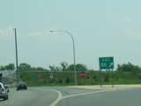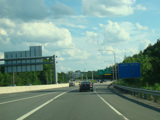 On the other side of the bridge, the expressway ends. There are a few traffic lights.