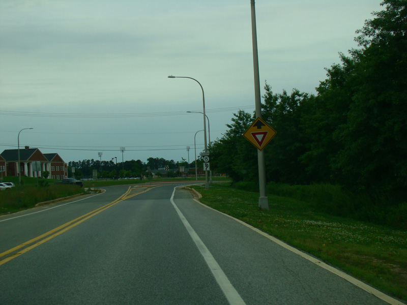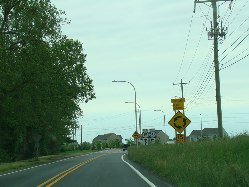 There is a traffic circle. Bethel Church Road splits off to the west as DE 286. DE 15 continues straight ahead as Choptank Road.
