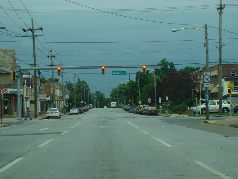 There is a traffic light at Lancaster Avenue (DE 48). Turn left to go east or right to go west.