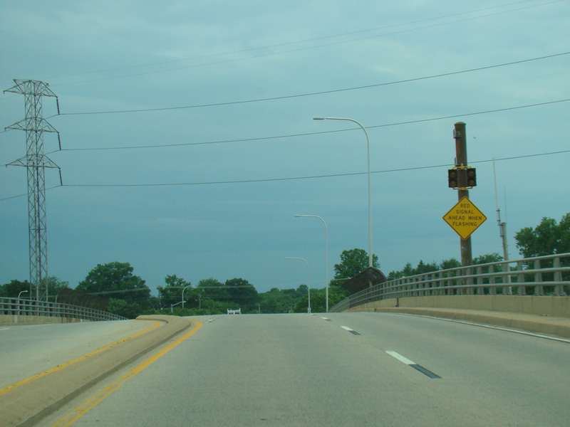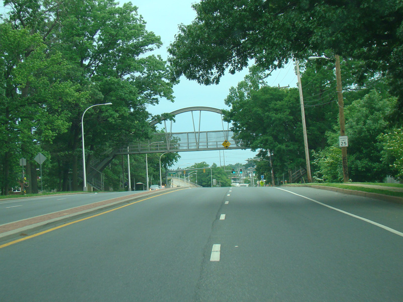 At the city line, the eastbound and westbound lanes come together to form Kirkwood Highway, a four-lane divided road. There is an arch-shaped pedestrian bridge.