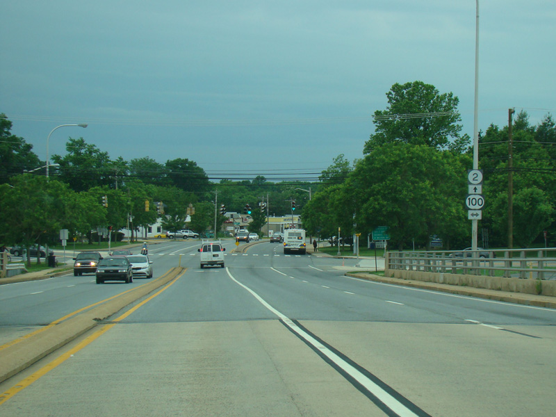 There is a bridge over railroad tracks. On the other side of the bridge, there is a traffic light at Dupont Road (DE 100). Turn right to go north or left to go south.