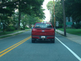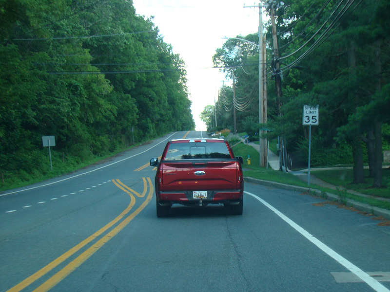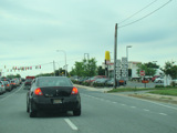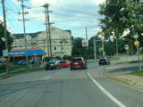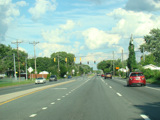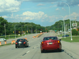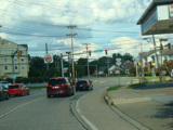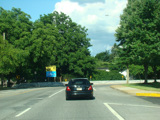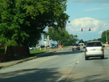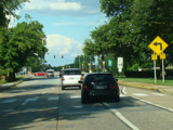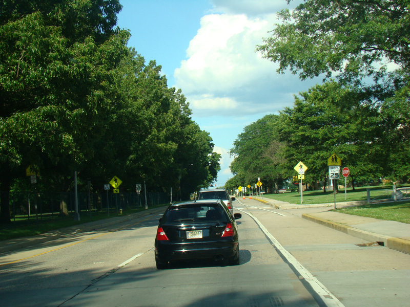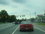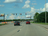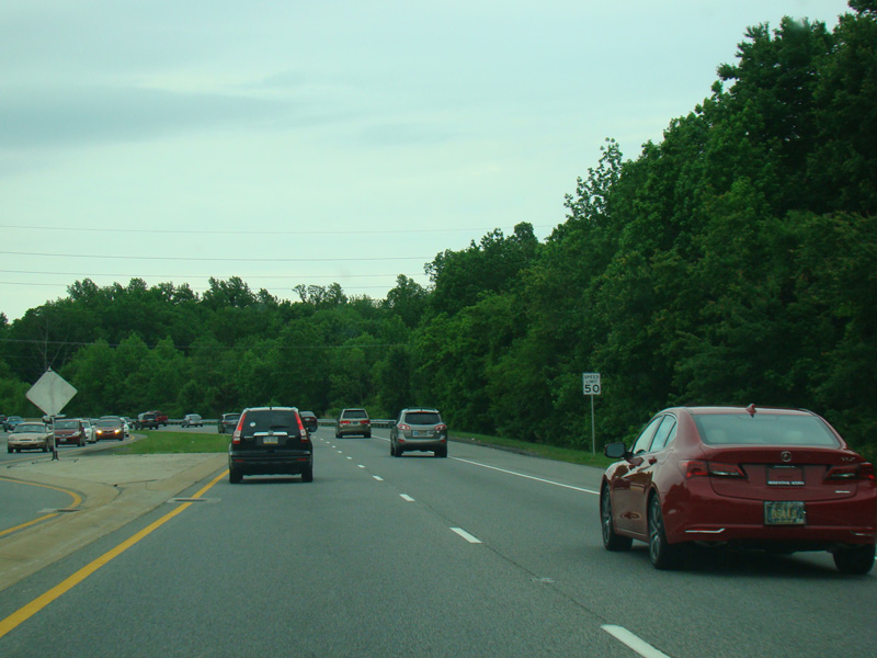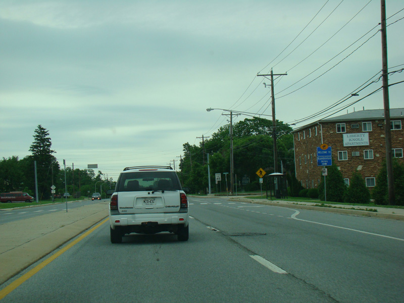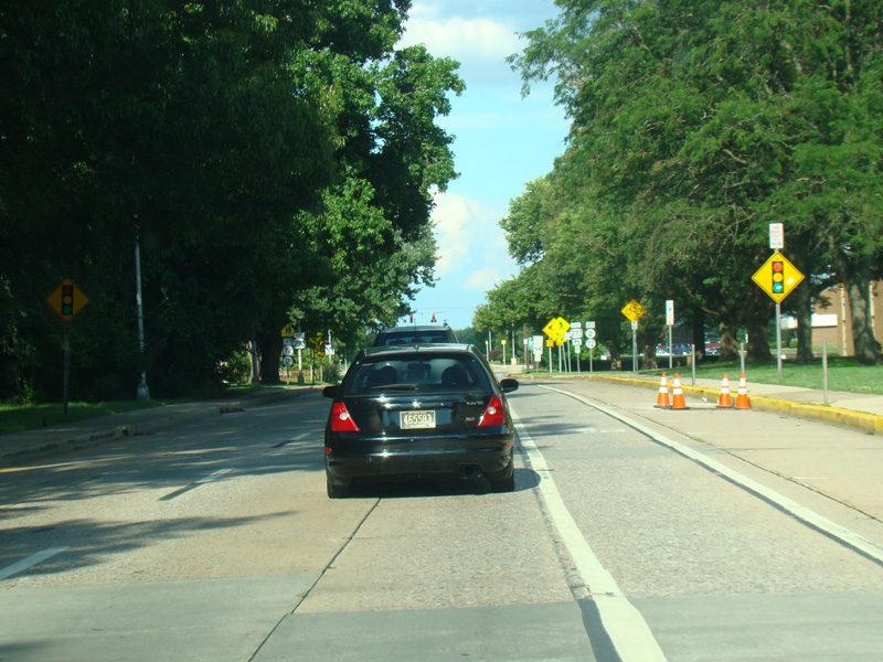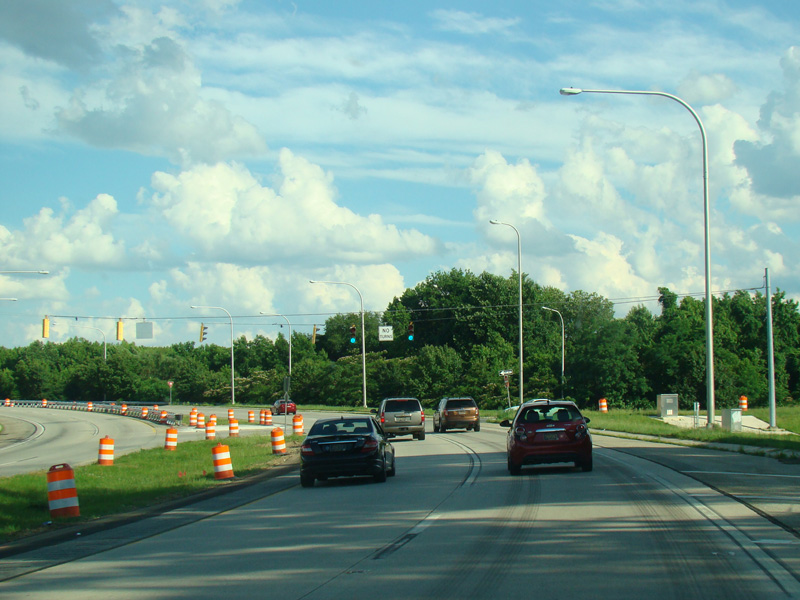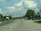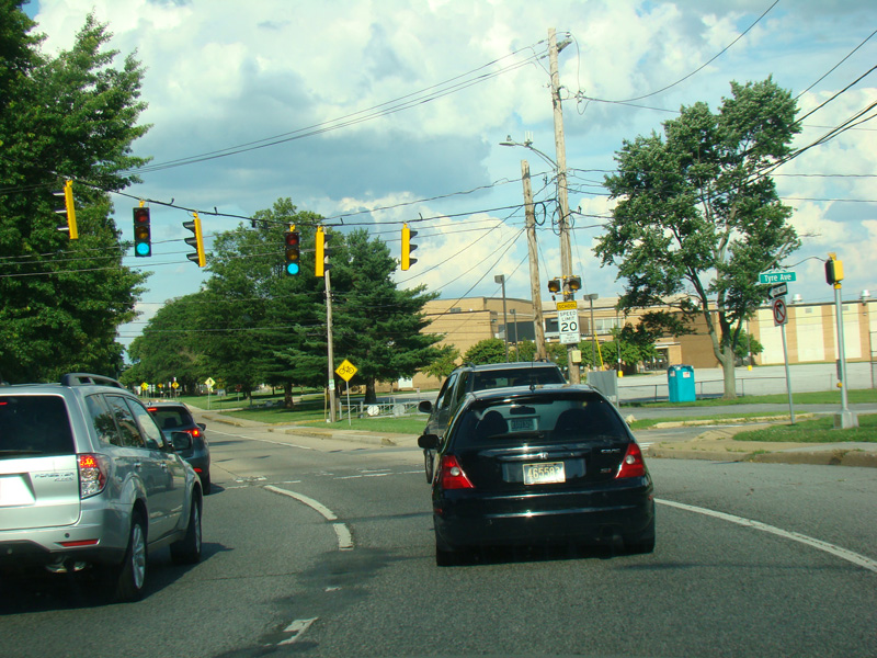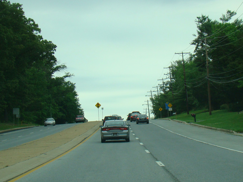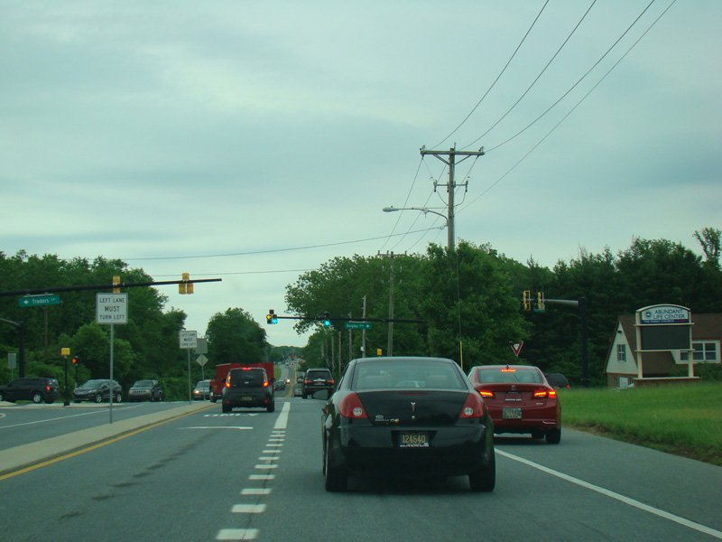 The roadway narrows down to two lanes, and the median ends. There are traffic lights at Traders Lane, Quigley Boulevard, and Centerpoint Boulevard.