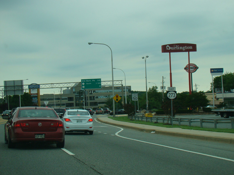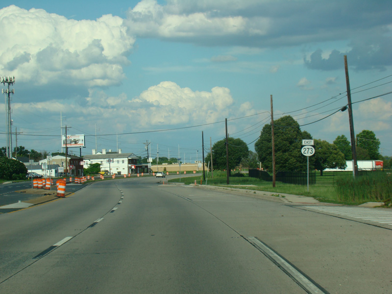DE 273 runs east as a four-lane divided highway. There is a traffic light at Old Baltimore Pike.