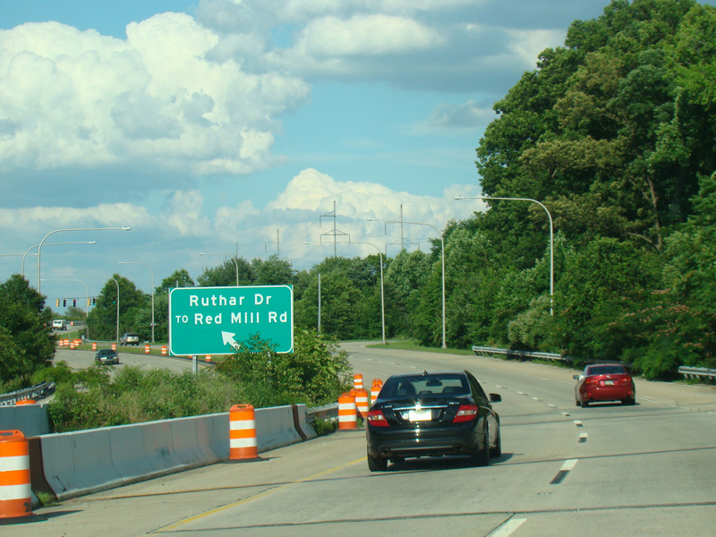 Ogletown Road runs east as a four-lane divided road. There is a traffic light at Ruthar Drive, which provides access to Red Mill Road, followed by a traffic light at Bala Road, which provides access to Red Mill Road and Ogletown Road.