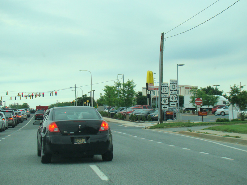 There is a traffic light at US 13/US 40. Turn left to go north and east or right to go south and west.