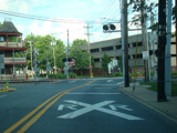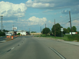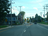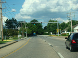 There is a railroad crossing. Immediately thereafter, West Main Street becomes a westbound one-way street. Southbound traffic is forced onto South Main Street.