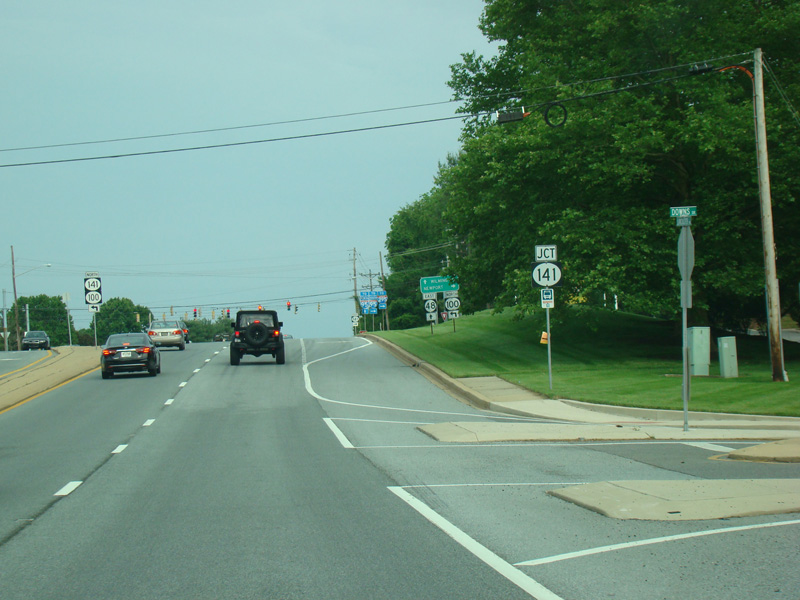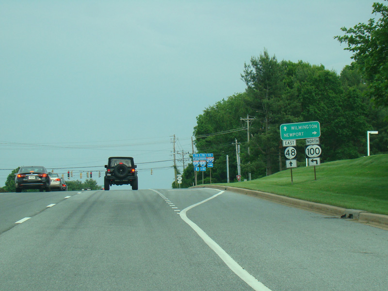 There is a traffic light at Centre Road (DE 141). Turn left to go north or right to go south. DE 100 is multiplexed with DE 141 to the left and with DE 48 straight ahead.