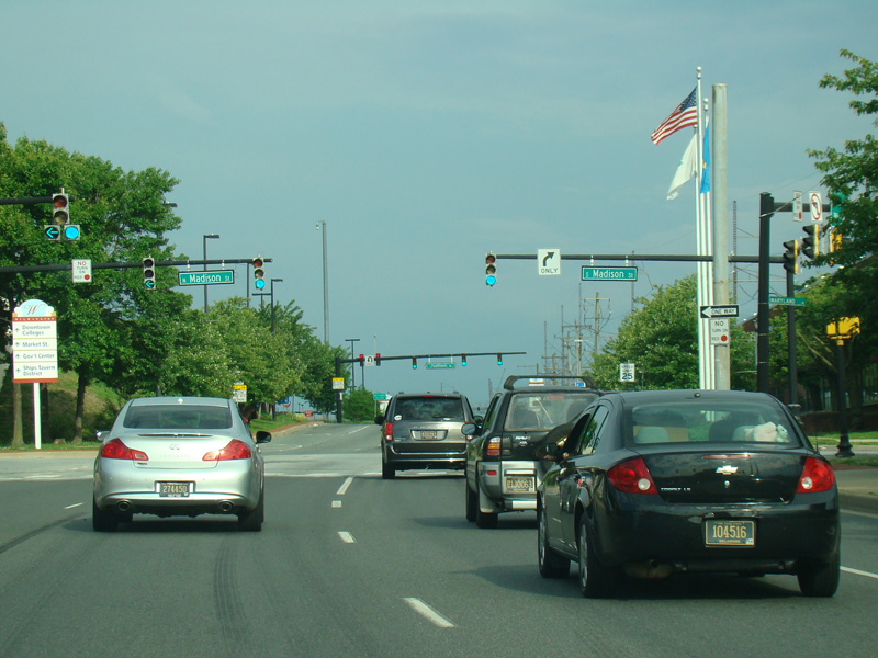 On the other side of the highway, DE 48 is known as Martin Luther King Jr. Boulevard. There are traffic lights at South Madison Street, North Madison Street, Justinson Street, West Street, Tatnall Street, and Orange Street.
