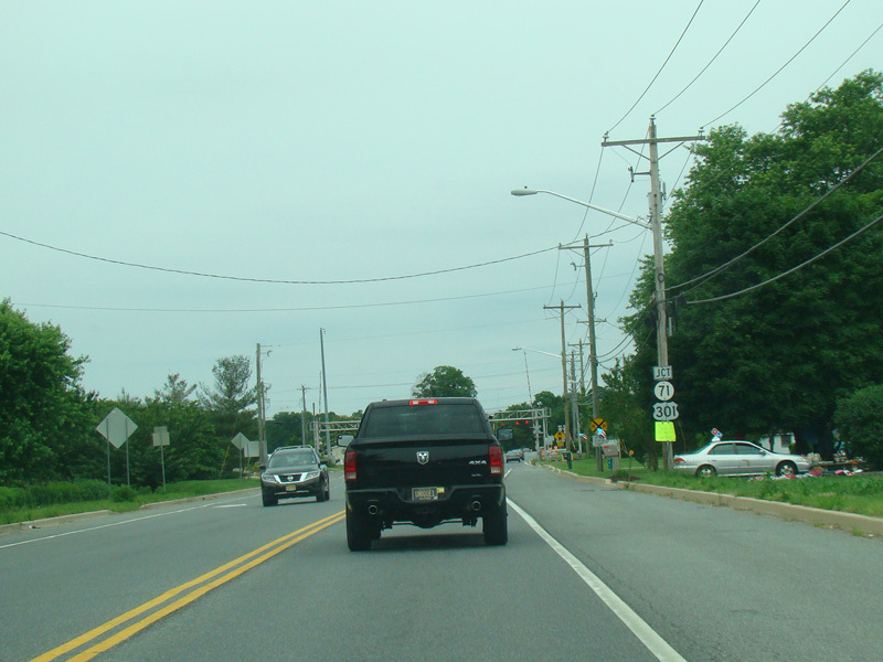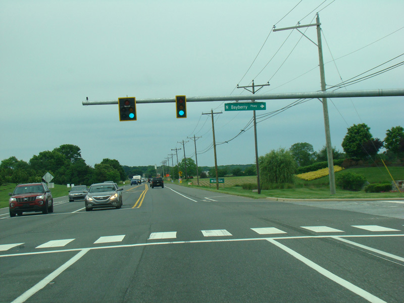 Boyds Corner Road runs west as a two-lane undivided road. There are traffic lights at South Bayberry Parkway, North Bayberry Parkway, Cedar Lane Road, and Jamison Corner Road.