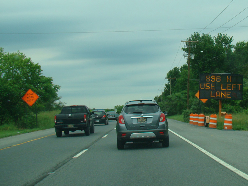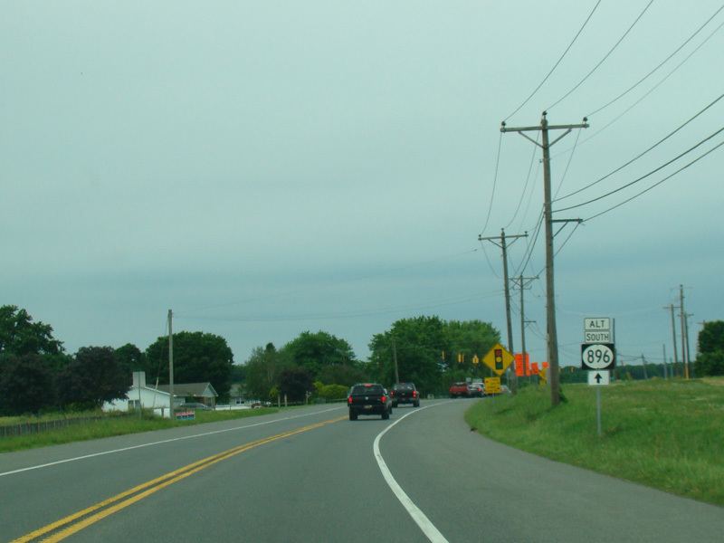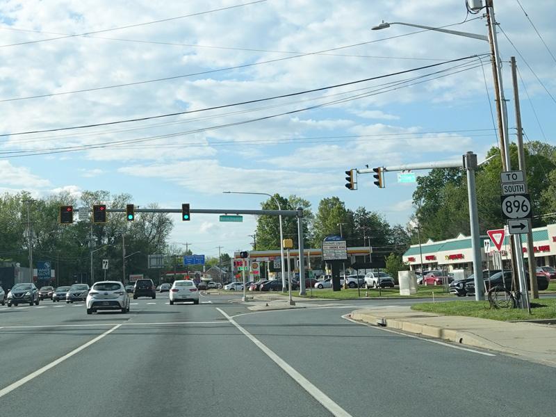 Summit Bridge Road ends at a traffic light at Pulaski Highway (US 40). Turn right to go east or left to go west. DE 896 continues straight ahead onto South College Avenue.