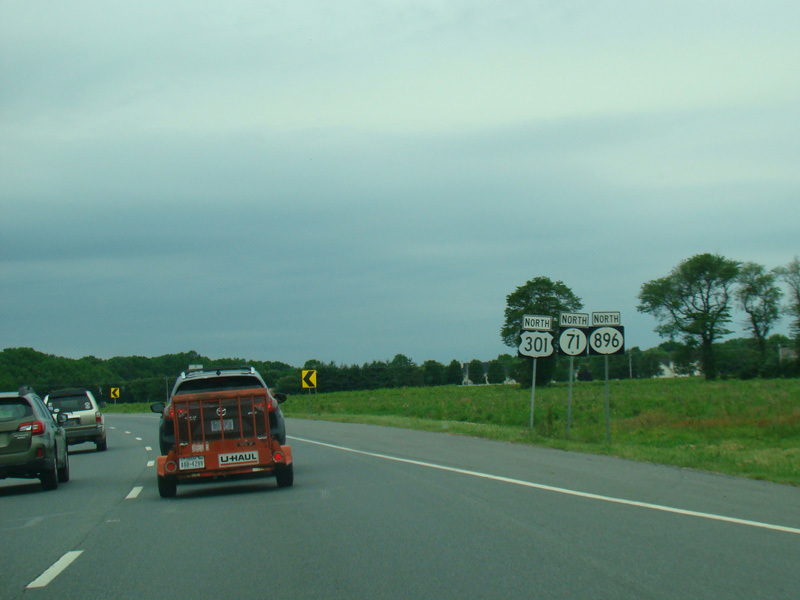 Boyds Corner Road ends at a traffic light at Summit Bridge Road (DE 71). Turn right to go north and to stay on DE 896. Turn left to go south. At the time that these pictures were taken, US 301 was also multiplexed along Summit Bridge Road. It has been rerouted along a new toll highway in the years since.