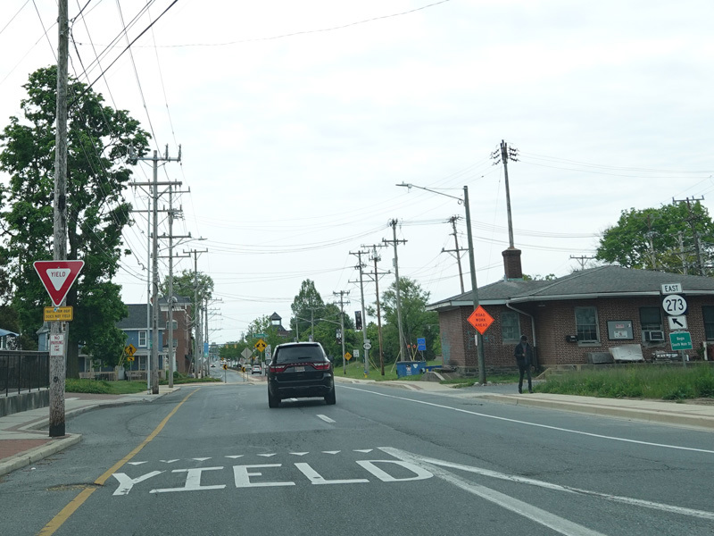 The roadway splits. Bear left onto West Delaware Avenue for DE 273. Bear right to stay on South Main Street for DE 896.