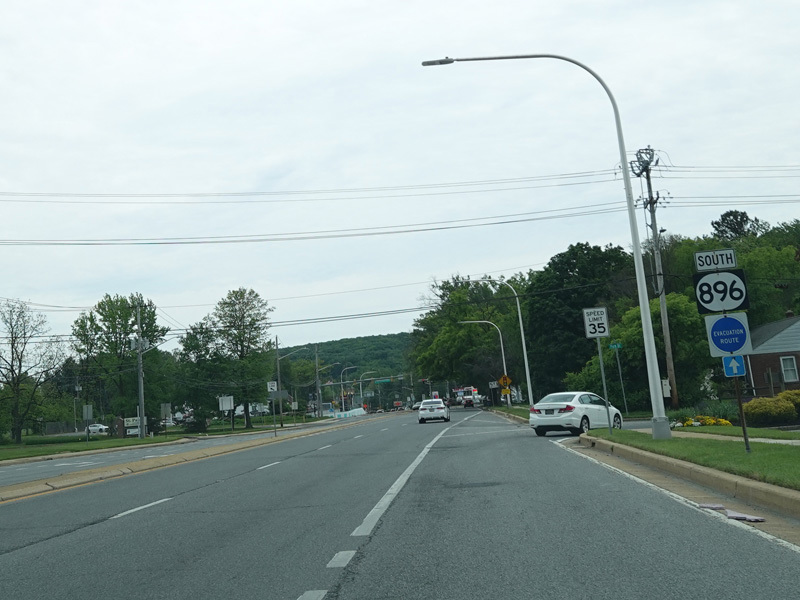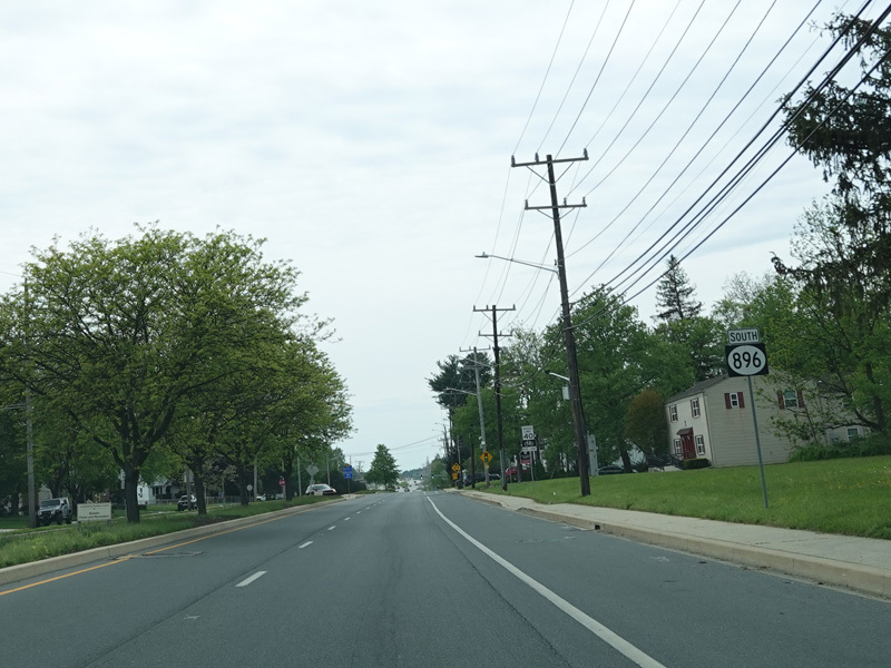 DE 896 splits off from Christina Parkway (DE 4) onto South College Avenue, which runs south as a four-lane divided road. There are traffic lights at West Chestnut Hill Road and Welsh Tract Road.