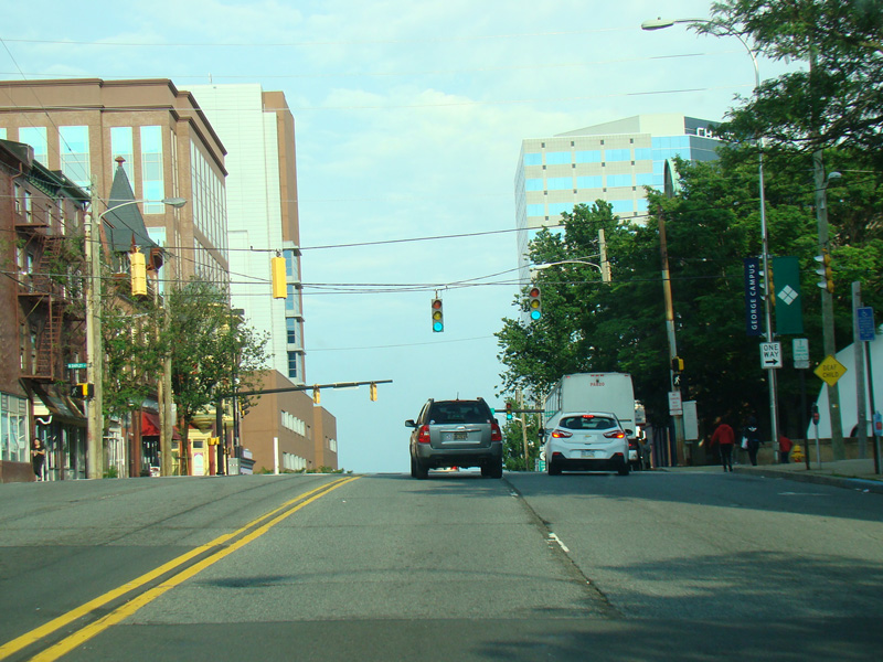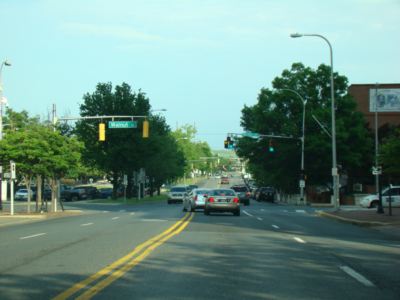 Fourth Street continues southeast. There is a traffic light at Orange Street.