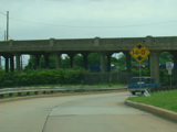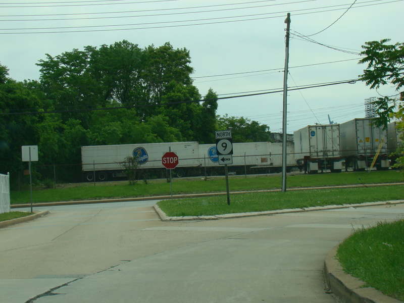 A ramp carries DE 9 from South Heald Street to New Castle Avenue. There is a stop sign at the end of the ramp. Turn right to continue south on DE 9 or left to head back north.