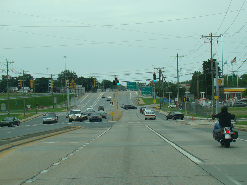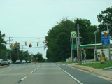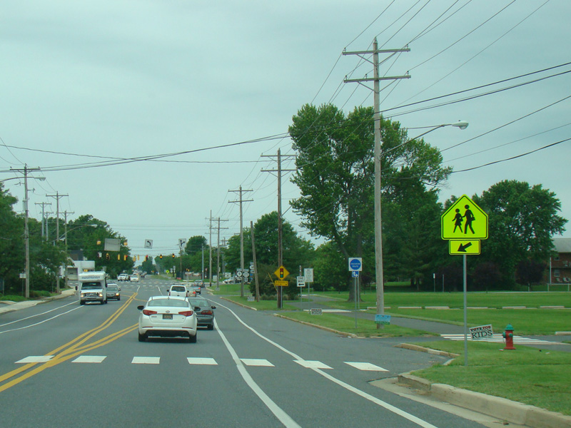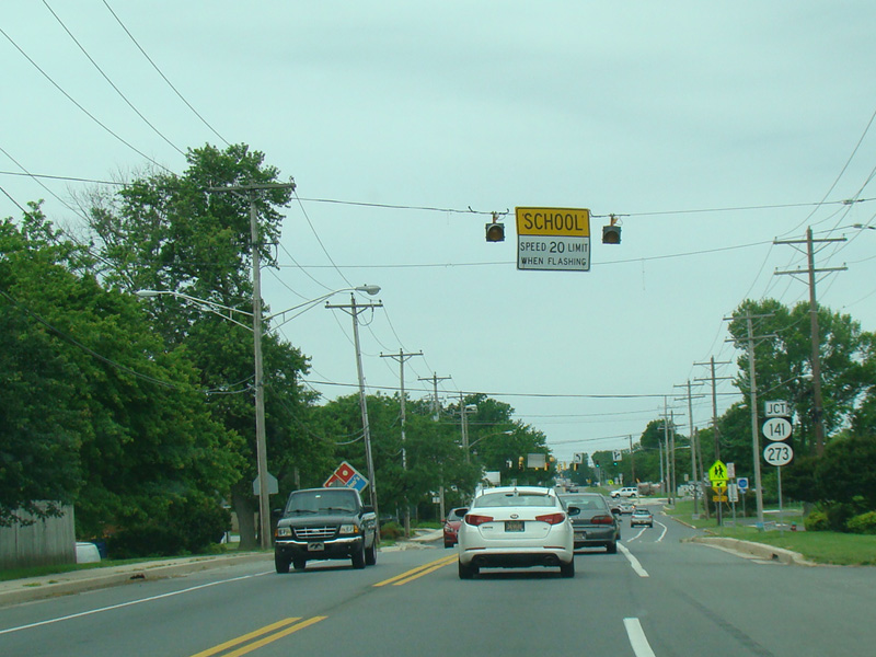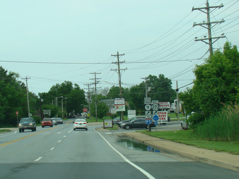After a short distance, there is a traffic light. Turn left onto Washington Street to stay on DE 9. DE 273 begins straight ahead. Basin Road (DE 141) begins on the right.