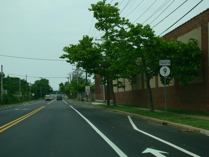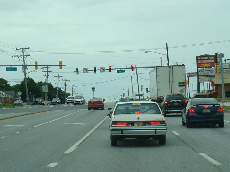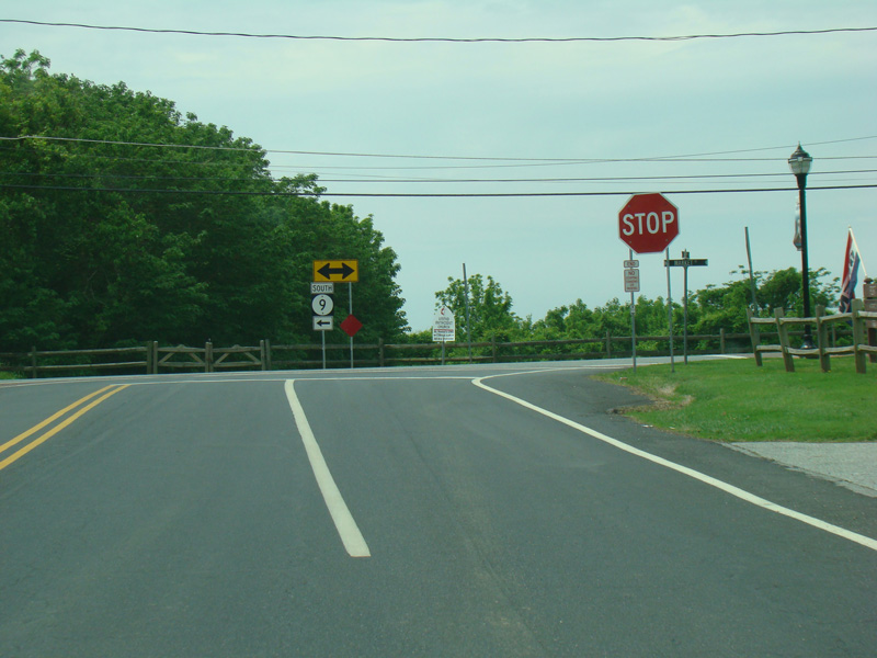 There is a traffic light at North Spruce Street (US 13). Straight ahead, DE 9 is multiplexed with US 13 along Fourth Street. There is no route signage at this intersection.