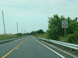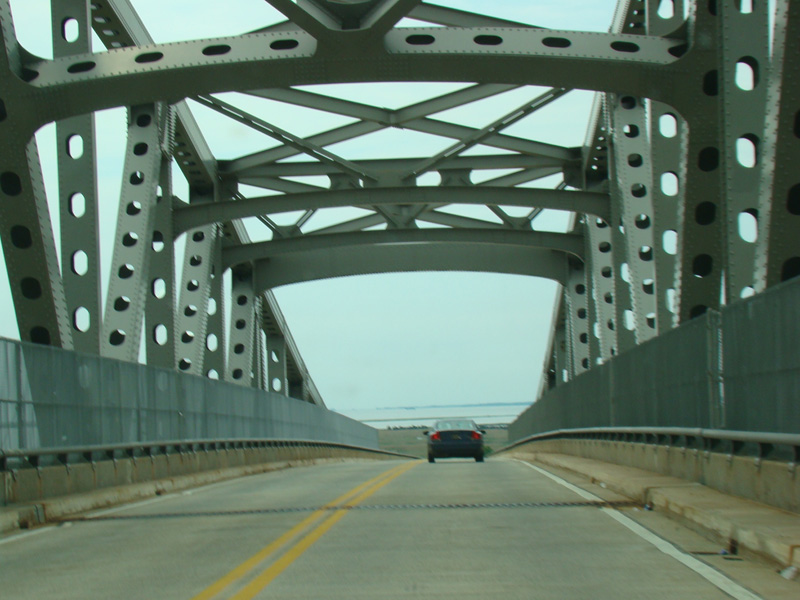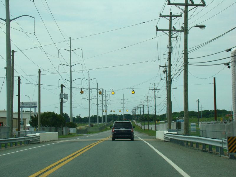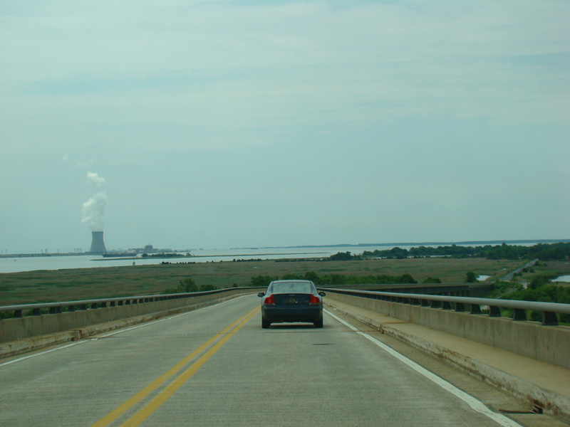The Reedy Point Bridge carries DE 9 across the Chesapeake and Delaware Canal. The Salem Nuclear Power Plant is visible across the bay in New Jersey.