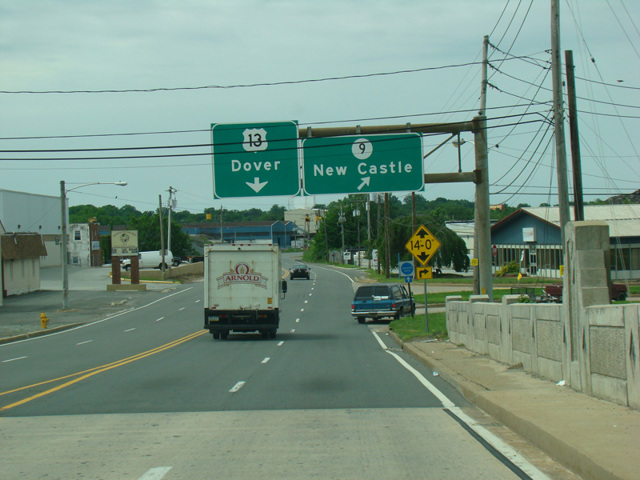 North of the Chesapeake and Delaware Canal, US 13 turns west to multiplex with DE 72 along Wrangle Hill Road for one block and then multiplexes with the DE 1 expressway. After one exit, it splits off and it known as Dupont Parkway once again. There are interchanges with I-295 and I-495, and then Dupont Parkway ends, narrowing down to become a two-lane undivided road called South Heald Street. US 13 follows South Heald Street and Fourth Street into Wilmington, where it is routed along a pair of parallel one-way streets, Church Street and Spruce Street. They come together after a few blocks to become Governor Printz Boulevard, which runs right next to I-495 before eventually curving away from the highway to end at Philadelphia Pike. US 13 turns north onto Philadelphia Pike and follows it north to Pennsylvania.