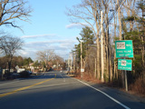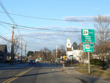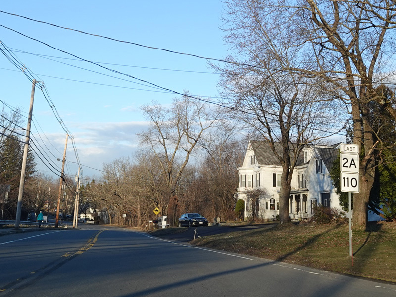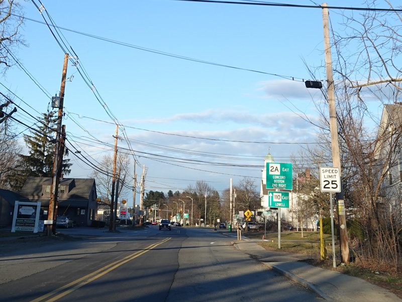 MA 2A splits off to the right. In this direction, it takes a shortcut along Stevens Street, a one-way street leading to Great Road (MA 119).
