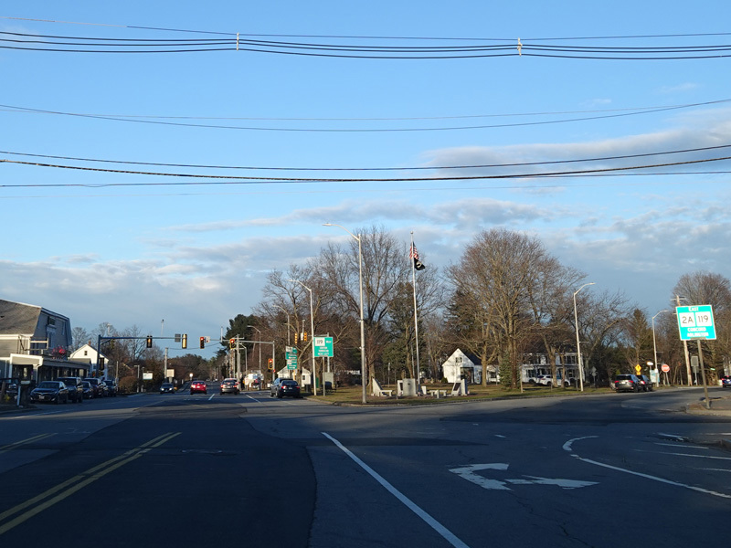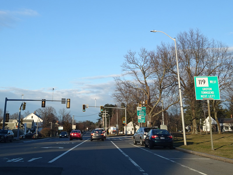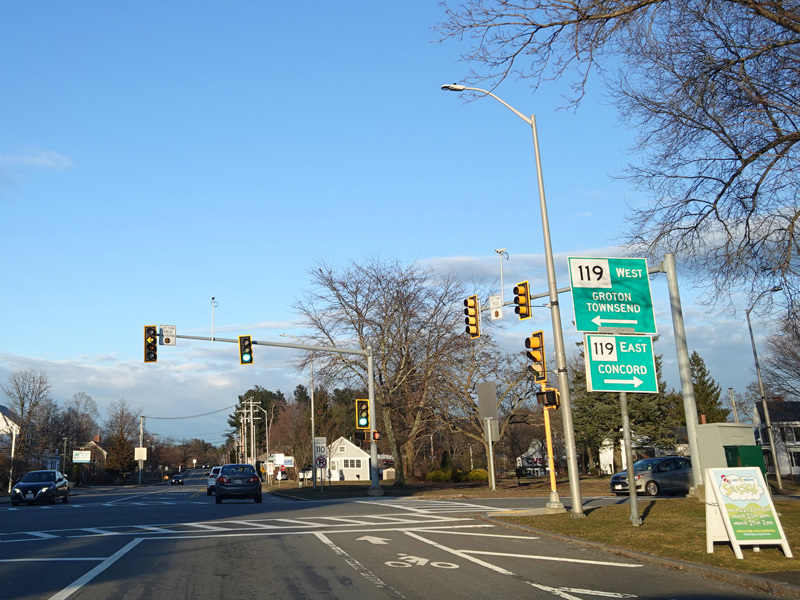 There is a traffic light at Great Road (MA 119). Turn right to go east or left to go west.