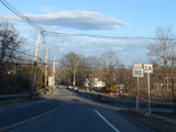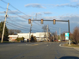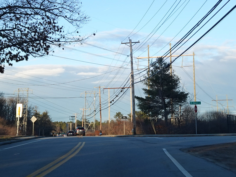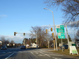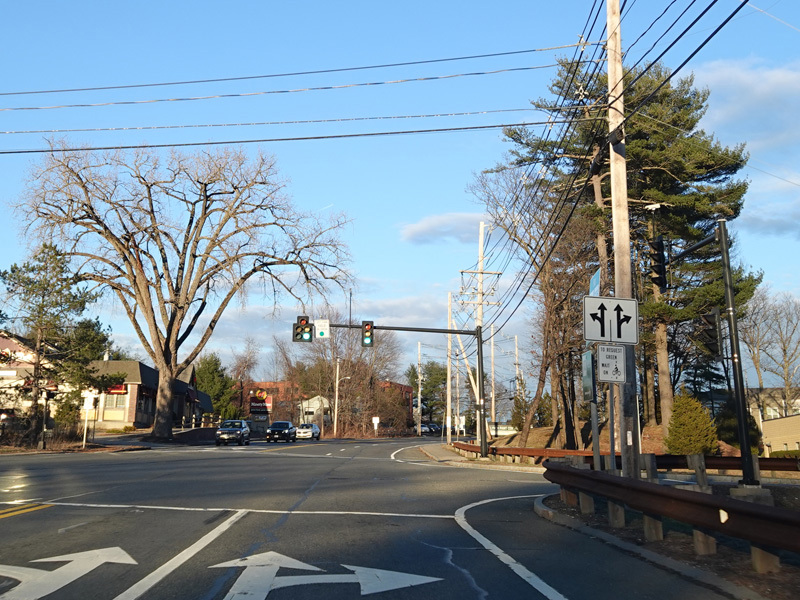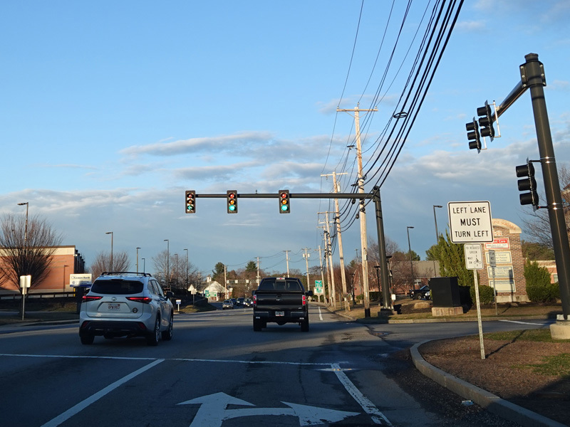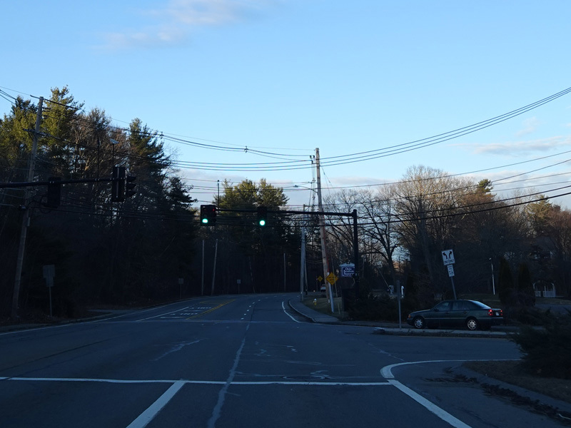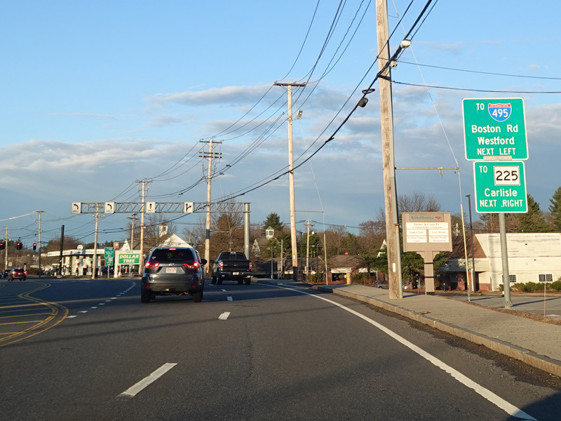 Boston Road begins on the left at a traffic light and provides access to I-495. Carlisle Road begins on the right and runs south to MA 225.