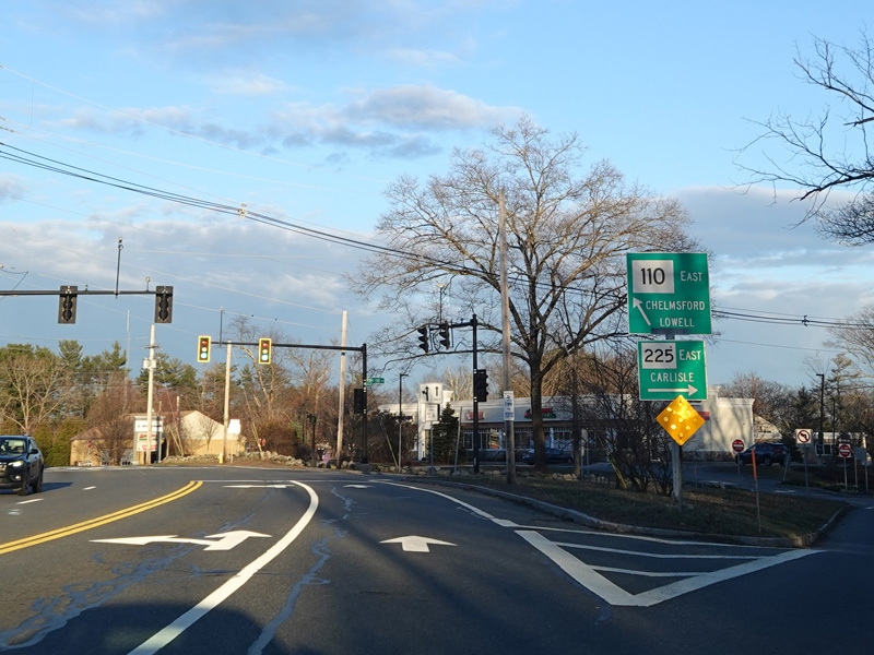 Littleton Road widens to four lanes. There is a traffic light at Concord Road (MA 225). Turn left to go west. Continue straight ahead to go east and to stay on MA 110.