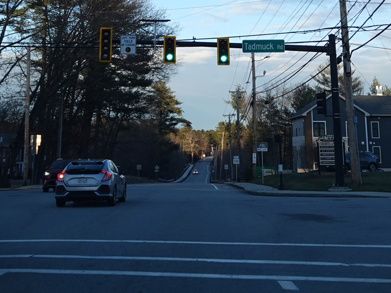 Littleton Road narrows down to two lanes. There is a traffic light at Tadmuck Road.
