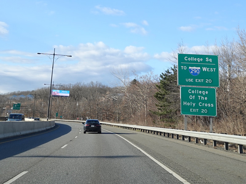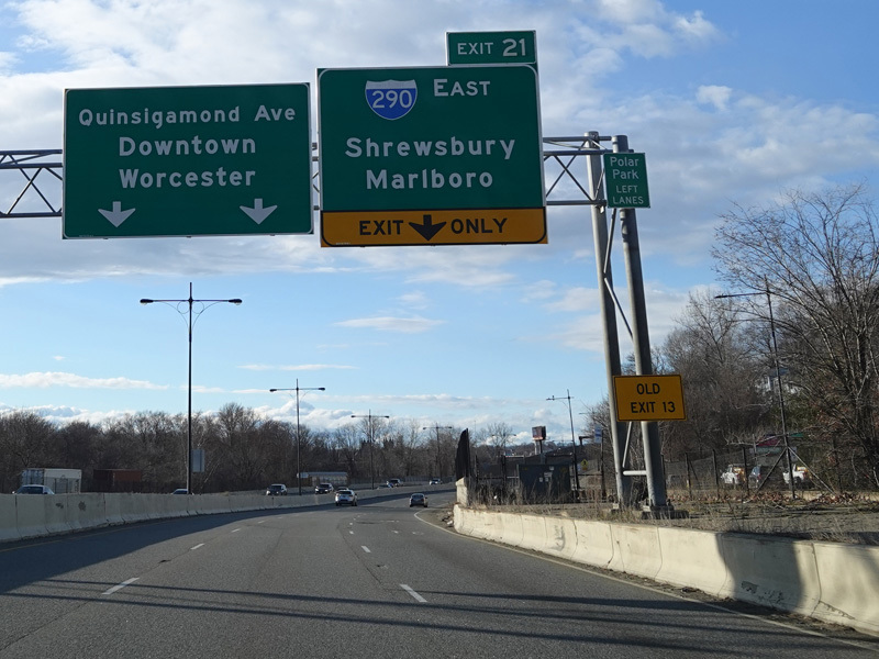 Exit 21 is for I-290 east. It is the last exit. The Worcester Providence Turnpike ends just ahead, becoming Quinsigamond Avenue.