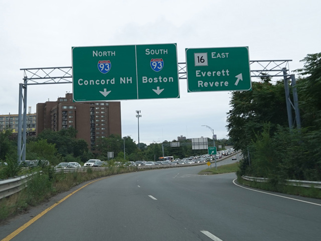 MA 16 is an east/west route running diagonally through the suburbs and exurbs of Boston. It begins in Webster at the point where MA 12 turns from East Main Street onto Worcester Road, just west of I-395. It runs east to Uxbridge and then northeast to Wellesley. After passing through interchanges with I-95/MA 128 and the Massachusetts Turnpike (I-90), it runs northeast through Watertown before reaching Cambridge. There, it is multiplexed with US 3 to the north along Fresh Pond Parkway, Concord Avenue, and Alewife Brook Parkway. At the northern end of Cambridge, US 3 splits off to follow Massachusetts Avenue (MA 2A). MA 16 continues along Alewife Brook Parkway to where it ends at Mystic Valley Parkway. It then follows Mystic Valley Parkway east to Medford, where it changes names to become Revere Beach Parkway. It ends in Revere at a traffic circle along MA 1A where MA 60 begins.