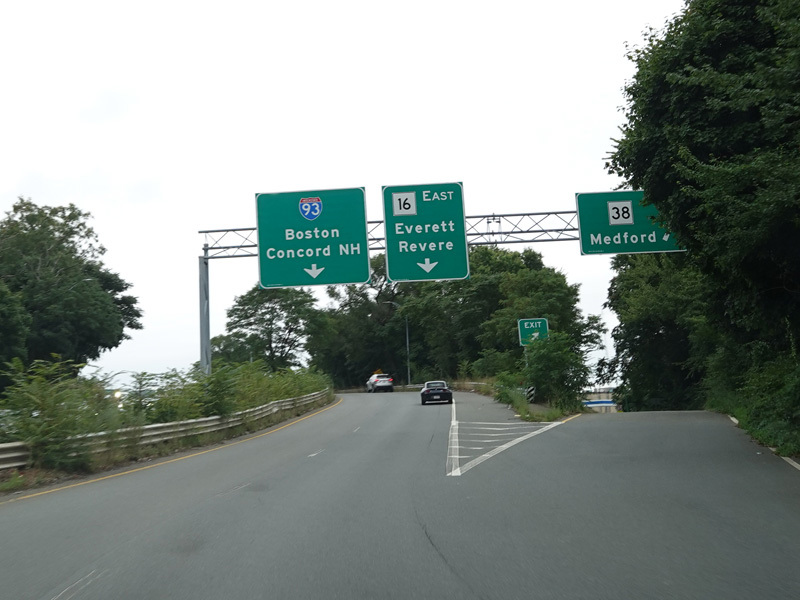 The roadway splits. Bear right to stay on MA 16. Continue straight ahead for access to I-93.