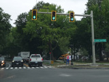 Mystic Valley Parkway narrows down to two lanes. There is a traffic light at Winthrop Street, which is designated MA 38 to the left. Southbound MA 38 is multiplexed with MA 16 straight ahead.
