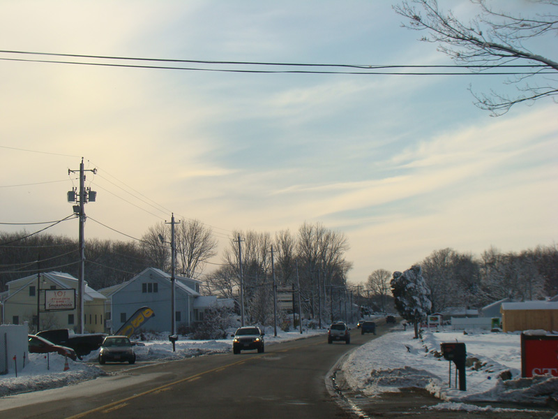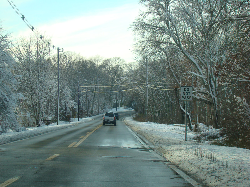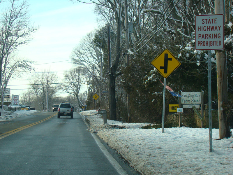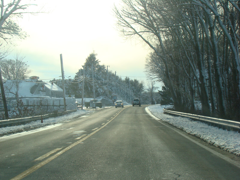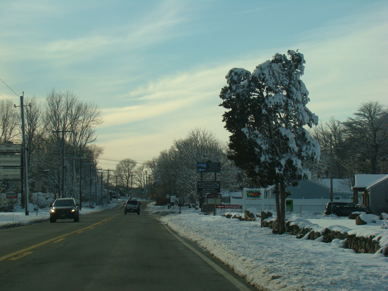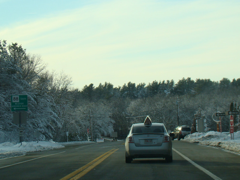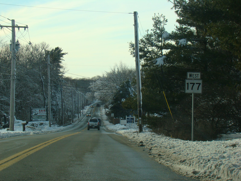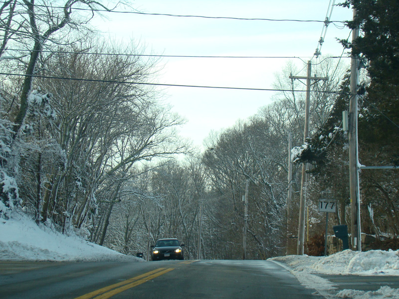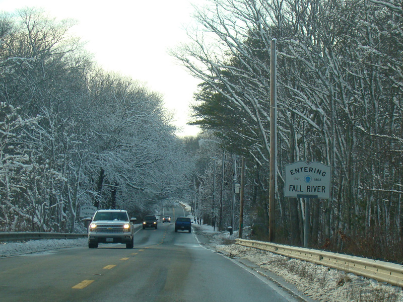 MA 177 cuts the corner of Fall River before crossing into Tiverton, Rhode Island. There is no state line signage here, only a Massachusetts-style town line sign for Tiverton. Bulgarmarsh Road (RI 177) is straight ahead.