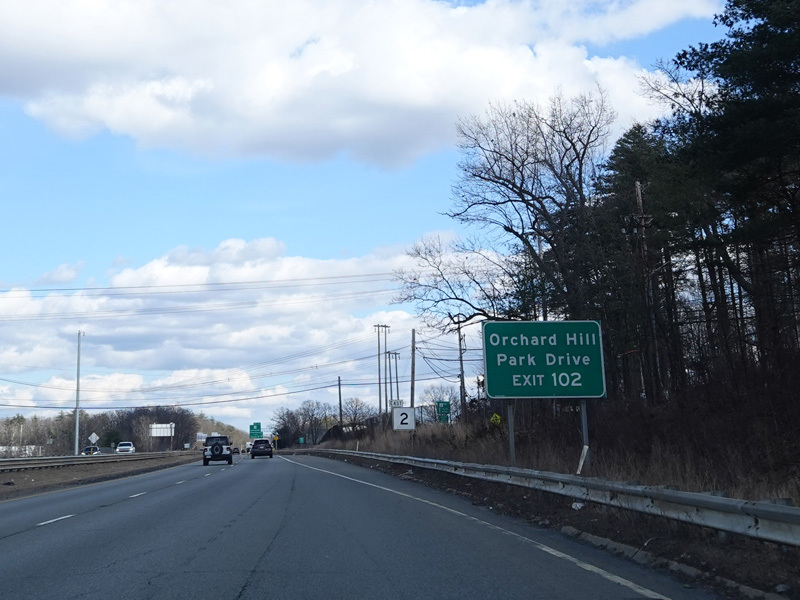 Exit 102 is for Mechanic Street and Harvard Street. It also provides access to Orchard Hill Park Drive.