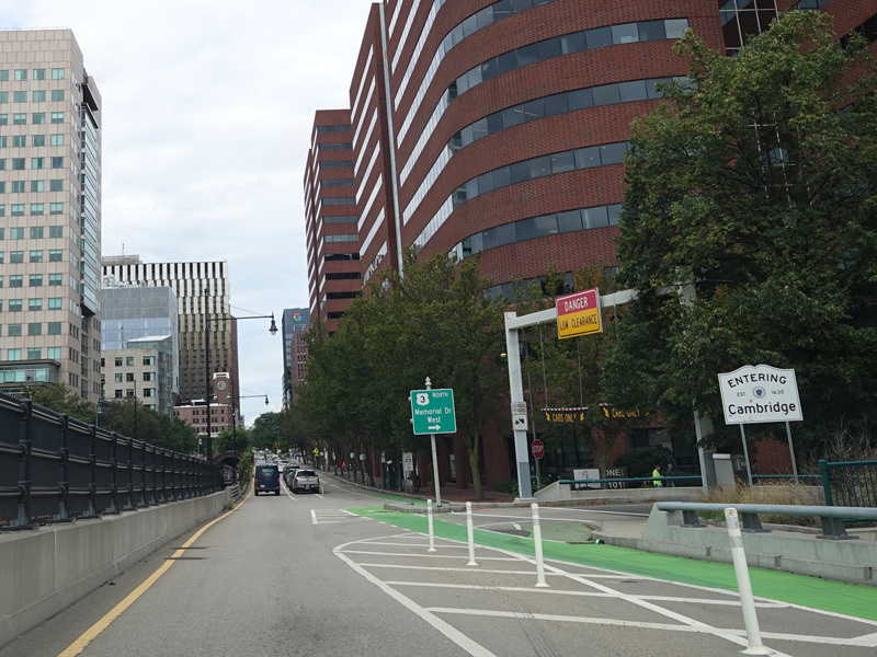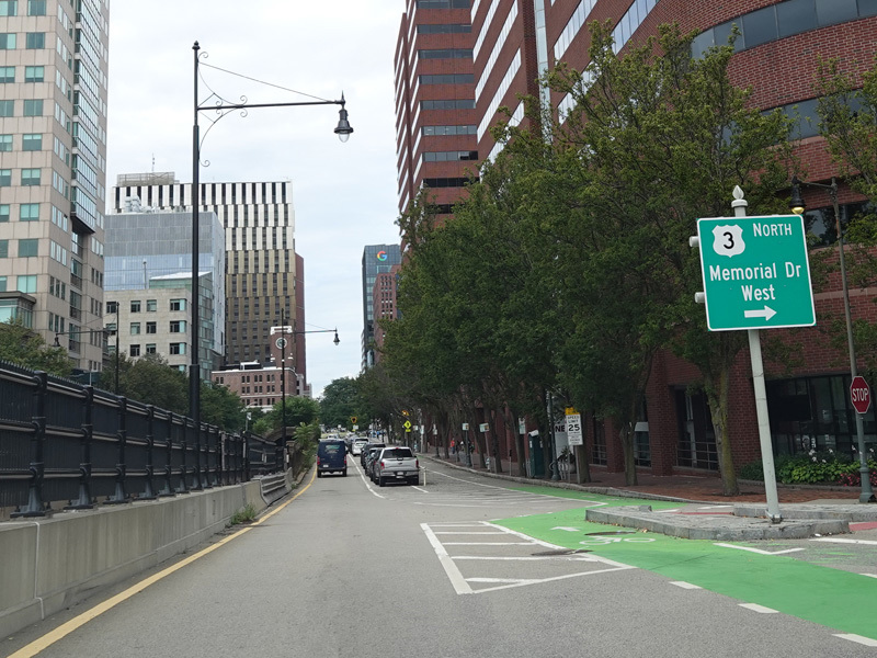 There is a grade-separated interchange at Massachusetts Avenue (MA 2A). Memorial Drive changes designation here to become US 3, although there is no signage to indicate so.
