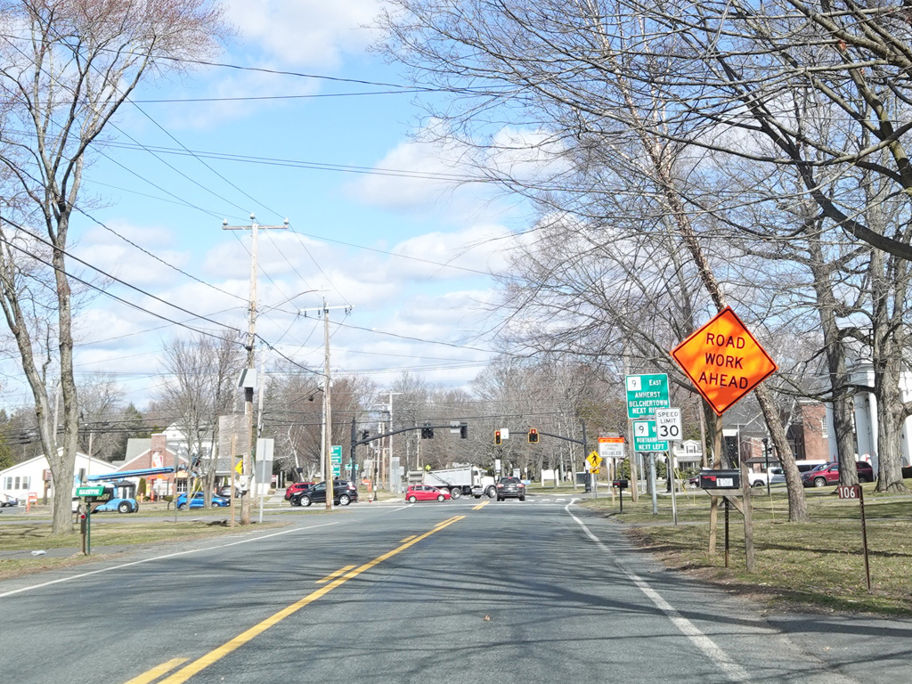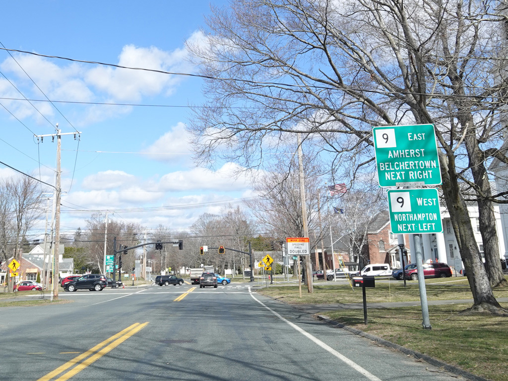 There is a traffic light at Russell Street (MA 9). Turn right to go east or left to go west.