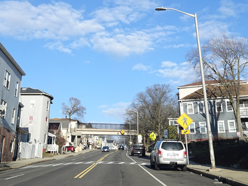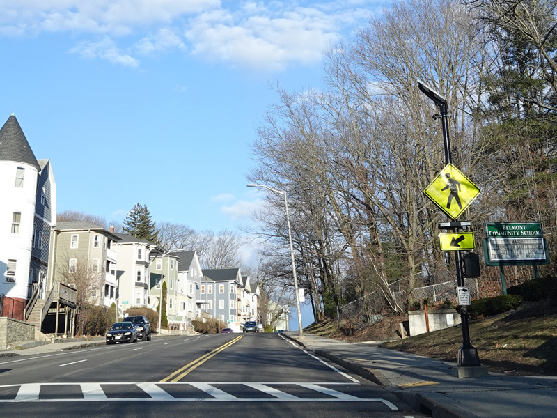 Belmont Street runs east through Worcester as a three-lane undivided road. There is one eastbound lane, but there are two westbound lanes.