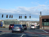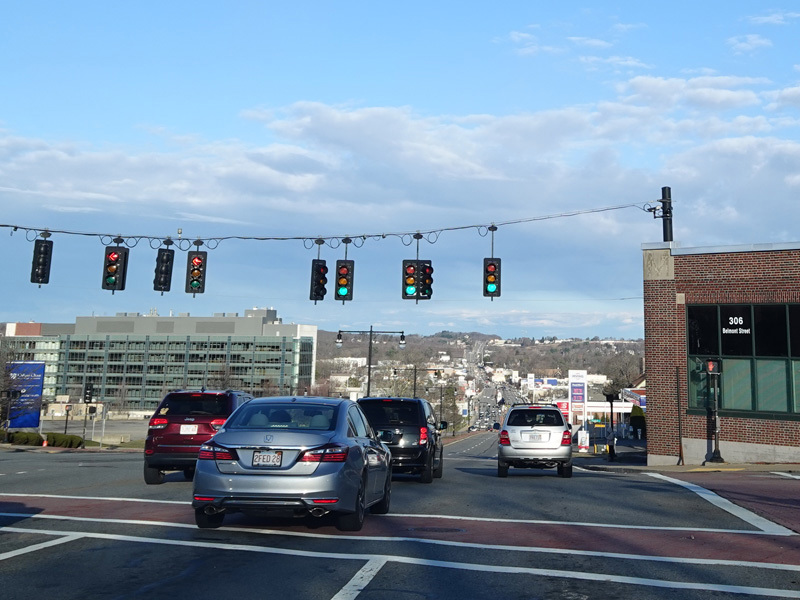 Belmont Street widens to become a four-lane divided highway. There are traffic lights at Shrewsbury Street and Plantation Street.