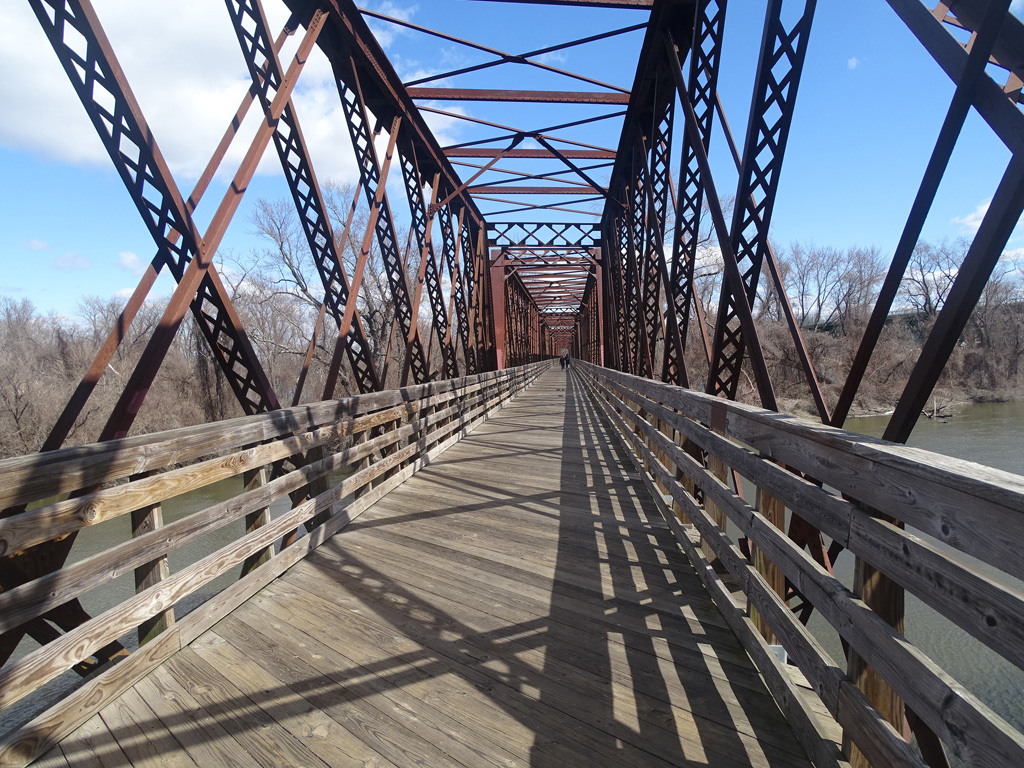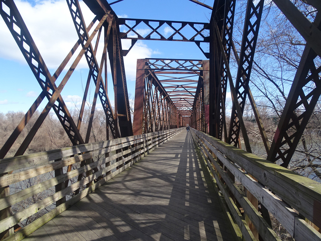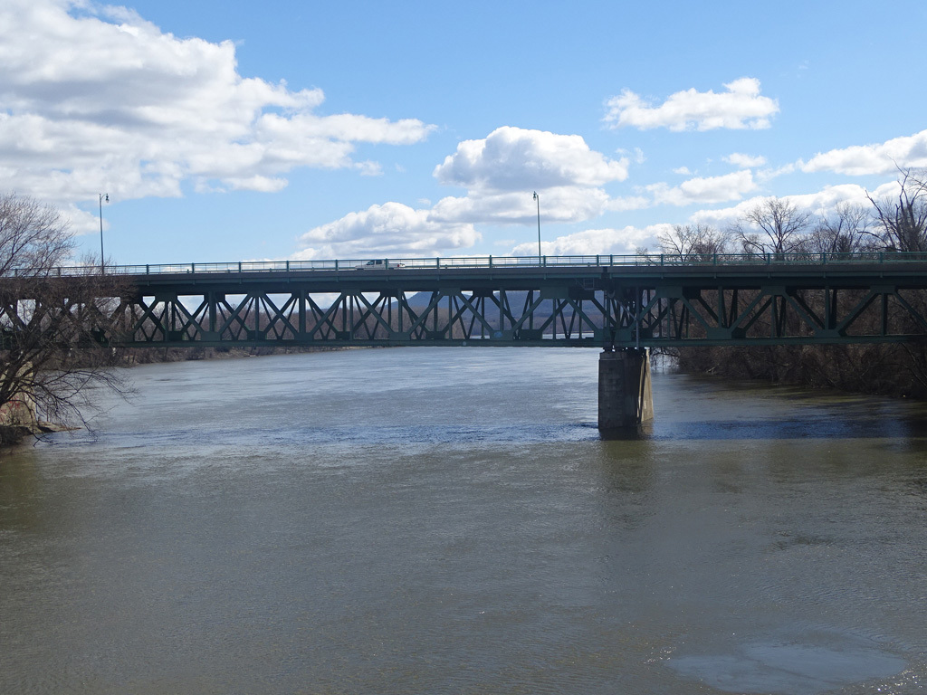 The Massachusetts Central Rail Trail crosses the Connecticut River via this bridge, located just north of the Calvin Coolidge Bridge.